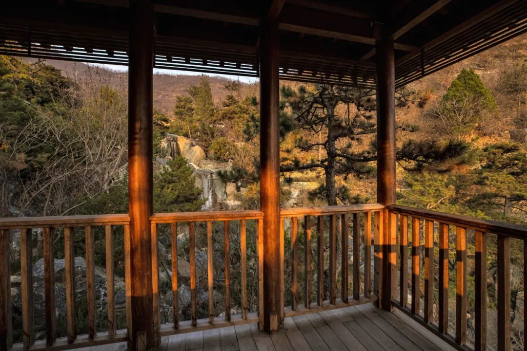 观月台位于酒店大堂的屋顶,从观月台向东望去便是东沟山谷,坐在潺潺流水边可遥望主瀑布的跌水,还可看到和从大堂门前眺望主瀑布时由于不同的视角而带来的不同的景致。这种“步移景异”的观景模式也是设计团队在现代酒店建筑空间里对传统造园思想的表现。
