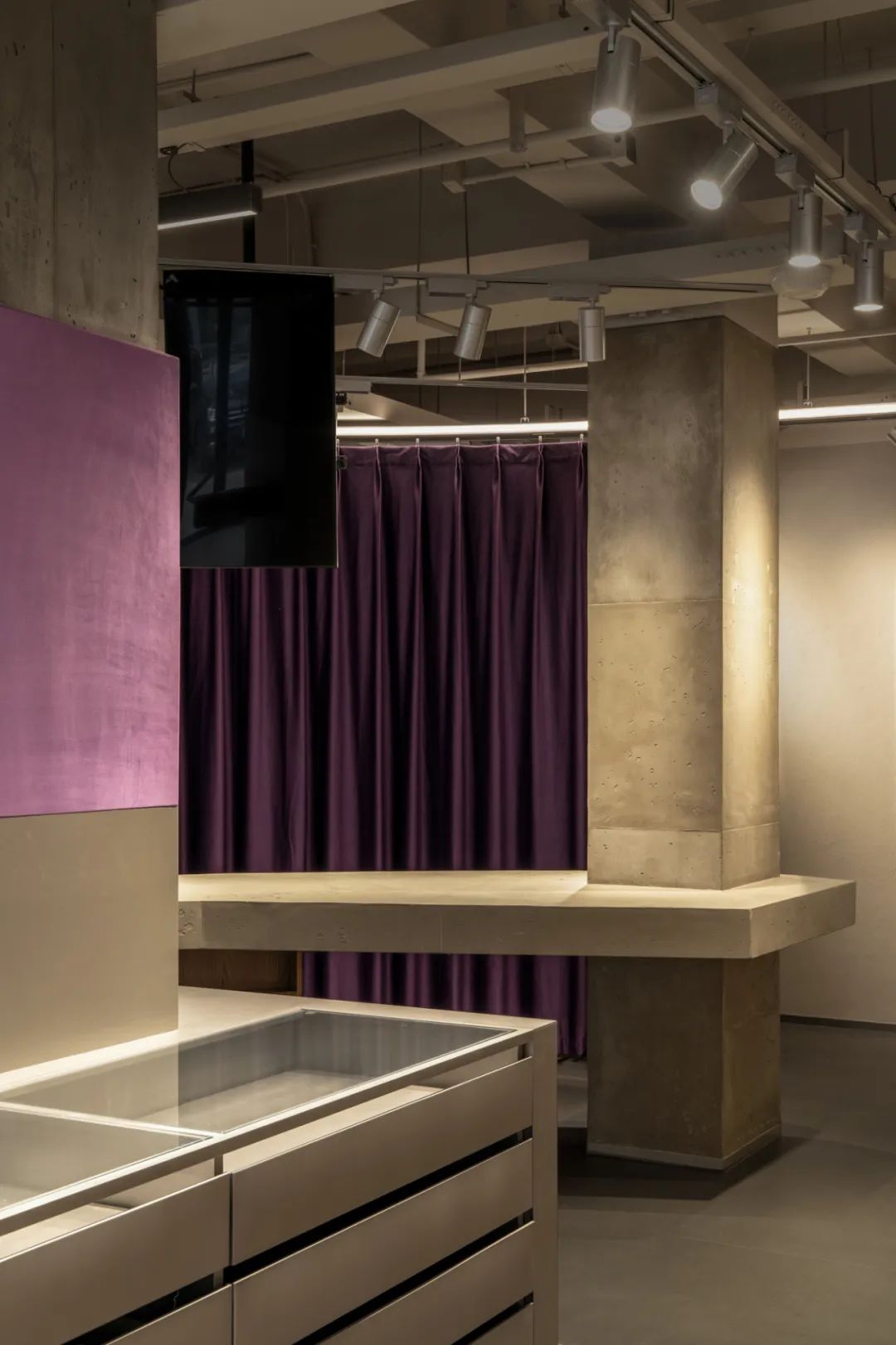 Purple, as the brand’s primary color, is subtly integrated throughout the space. The rest of the design employs neutral colors and materials to ensure spatial cohesion. Using an installation-style approach, we create visual tension and a sense of ritual, enhancing the experiential quality of the space.