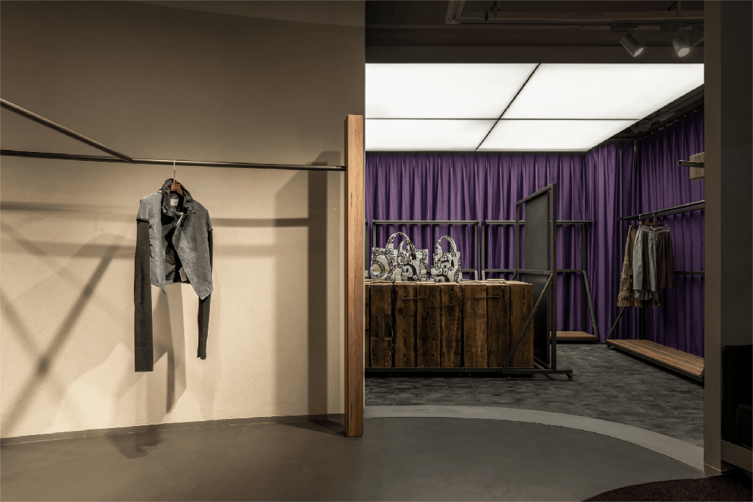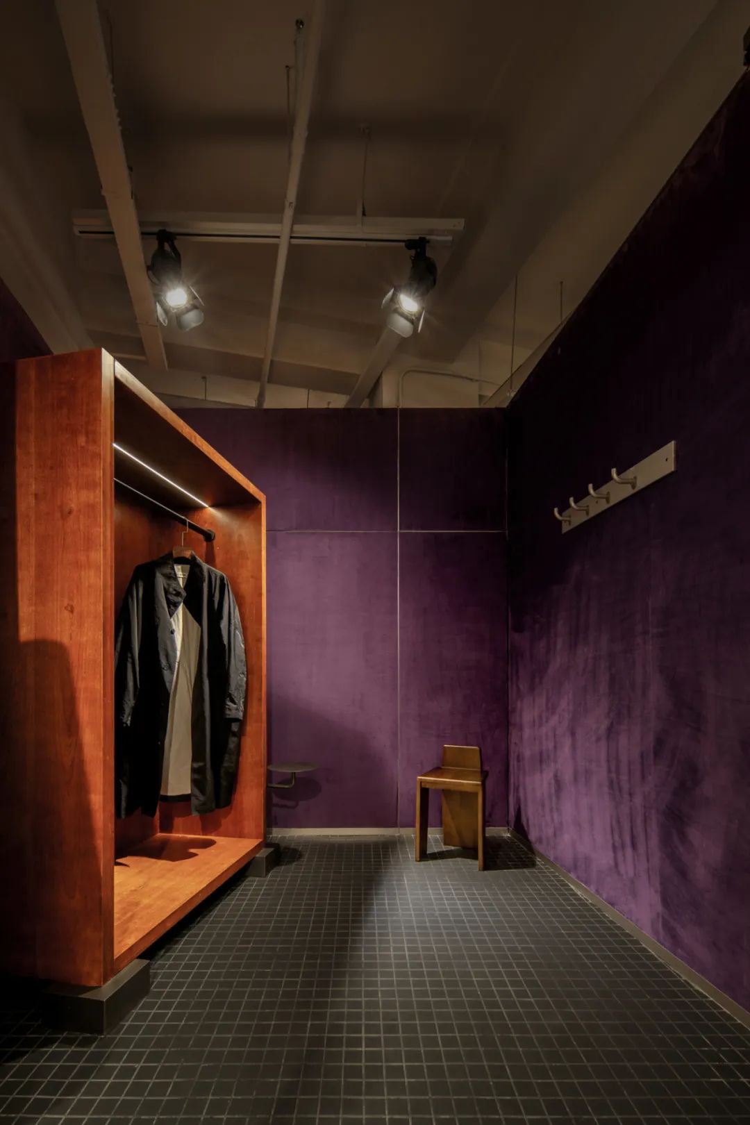 紫色是品牌主色,以点缀的方式贯穿整个空间,其余部分我们通过客观颜色和材质打造空间的整体性。我们以装置的手法切入,创造视觉张力和仪式感,在经营中增加体验属性。