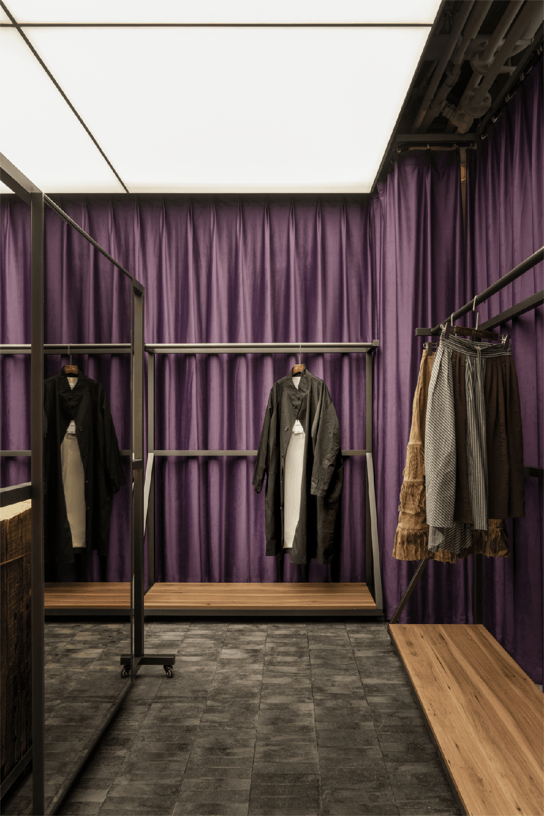 设计通过一系列曲线的墙体,把空间分为开放区和私密区。将活动区、卫生间、试衣间、储物、办公区以及接待区统统放置在曲线墙面的背后,留出大面积开放的经营空间。