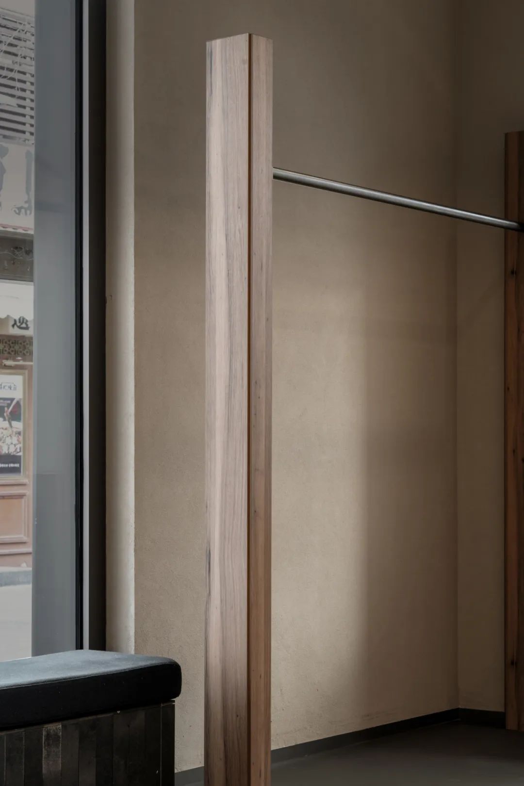 在开放的经营区域里,我们将柱子与功能体块结合,来消隐过多的柱子。我们围绕柱子制作吧台、展示架、展柜等一些列空间构成。