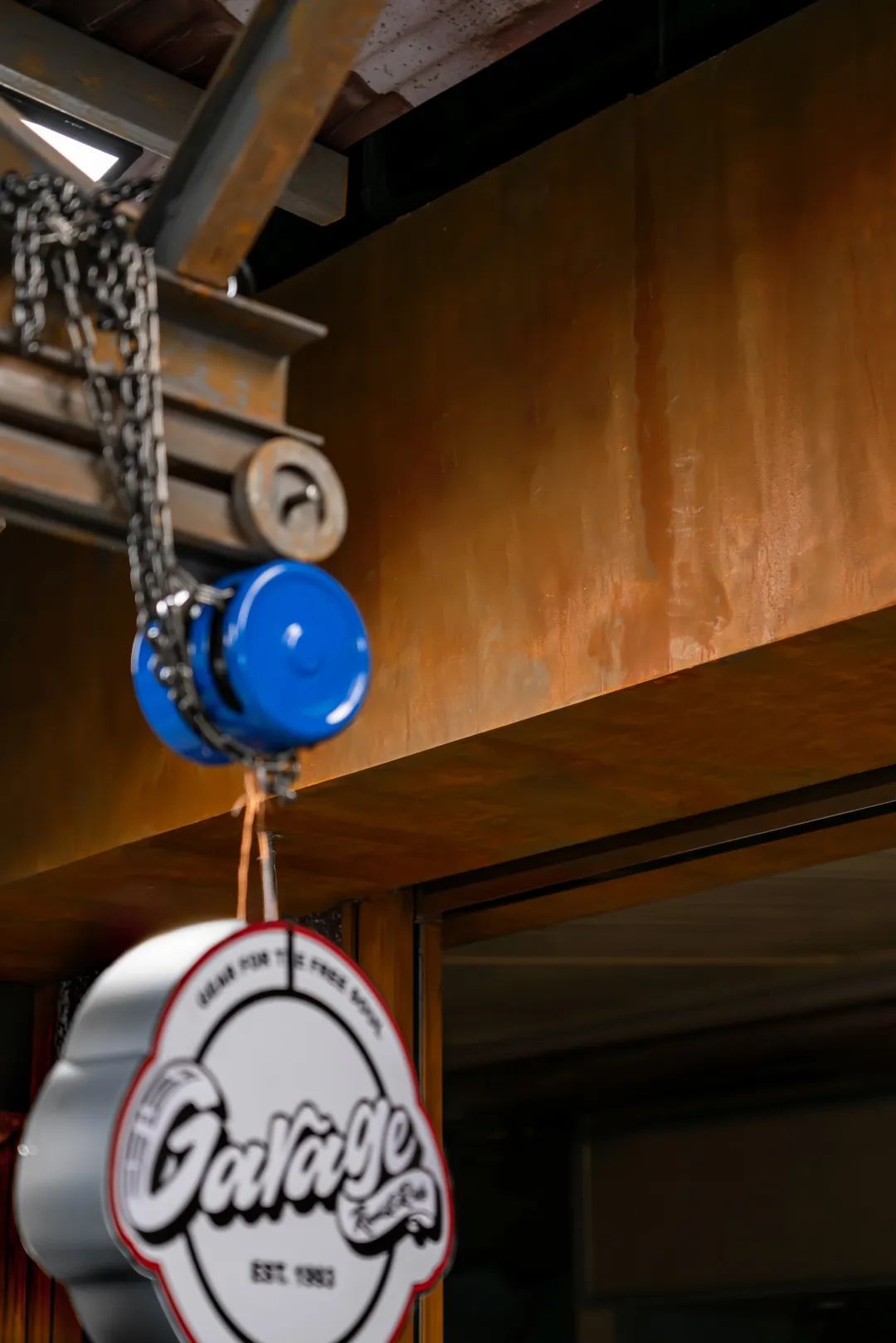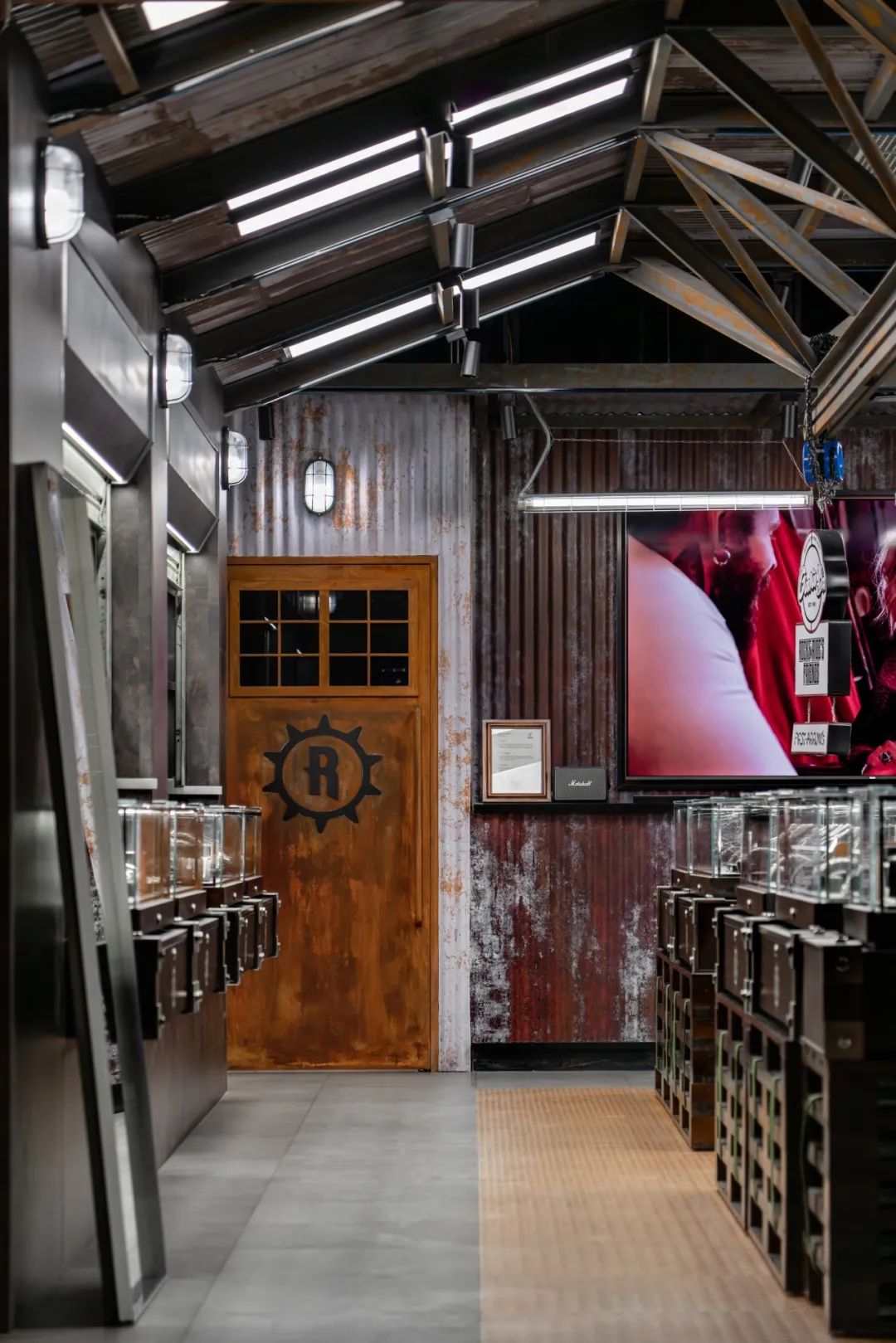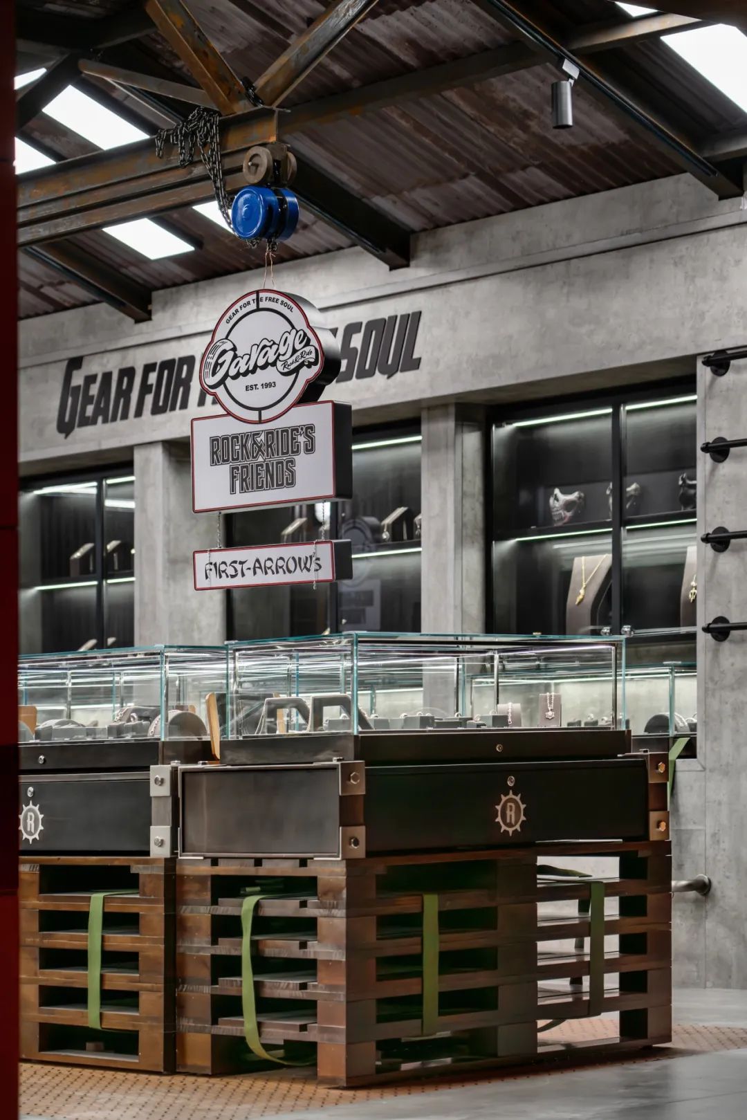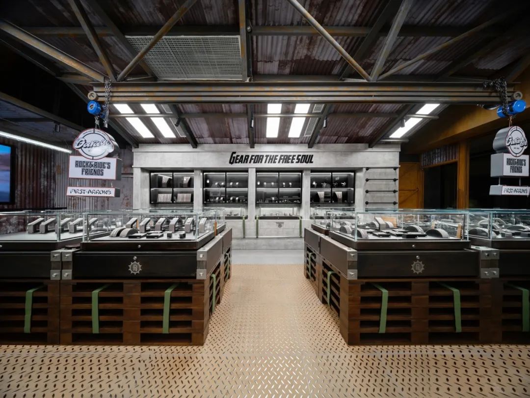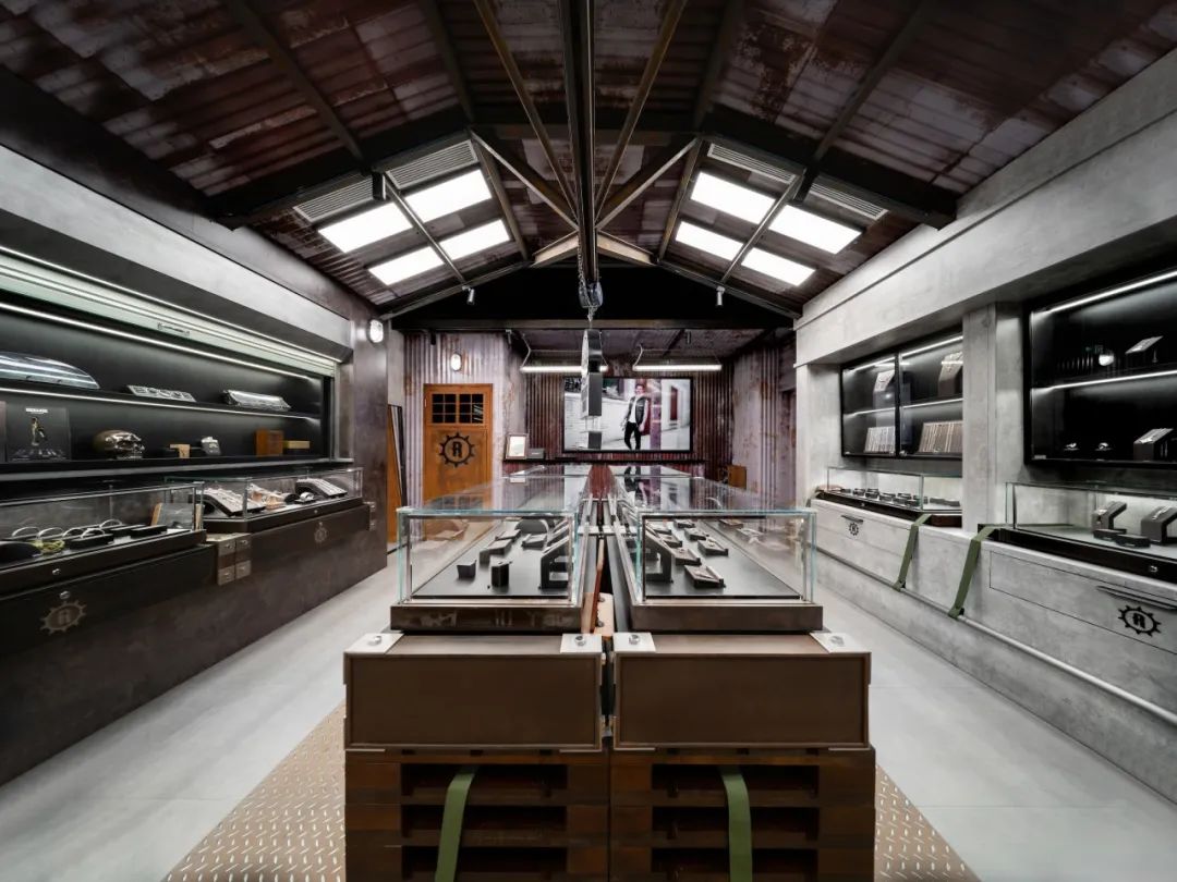 中岛地面采用花纹钢板,以绑带连接的木托盘作为展台,将三角桁架、起重吊钩、复古壁灯、喷绘标语等元素运用在空间中,细节的触点增添了工业氛围和粗犷质感。