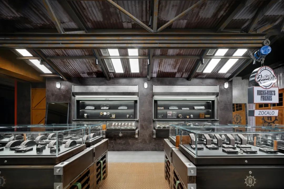 废旧金属元素搭配粗糙质感的混凝土,玻璃展柜搭配经典的黑色皮革,彰显出饰品非凡的格调,工业风与精致感在此碰撞融合。