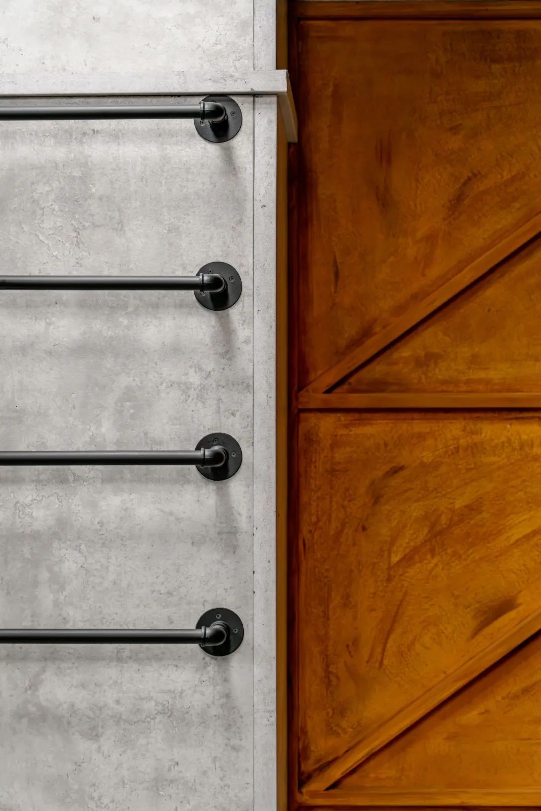 一侧墙面的展架镶嵌在车库的卷帘门内,仿佛是神秘限定的收藏,增加空间的趣味性。另一侧是用绑带将展柜固定在墙上,与中岛柜细节元素相呼应。