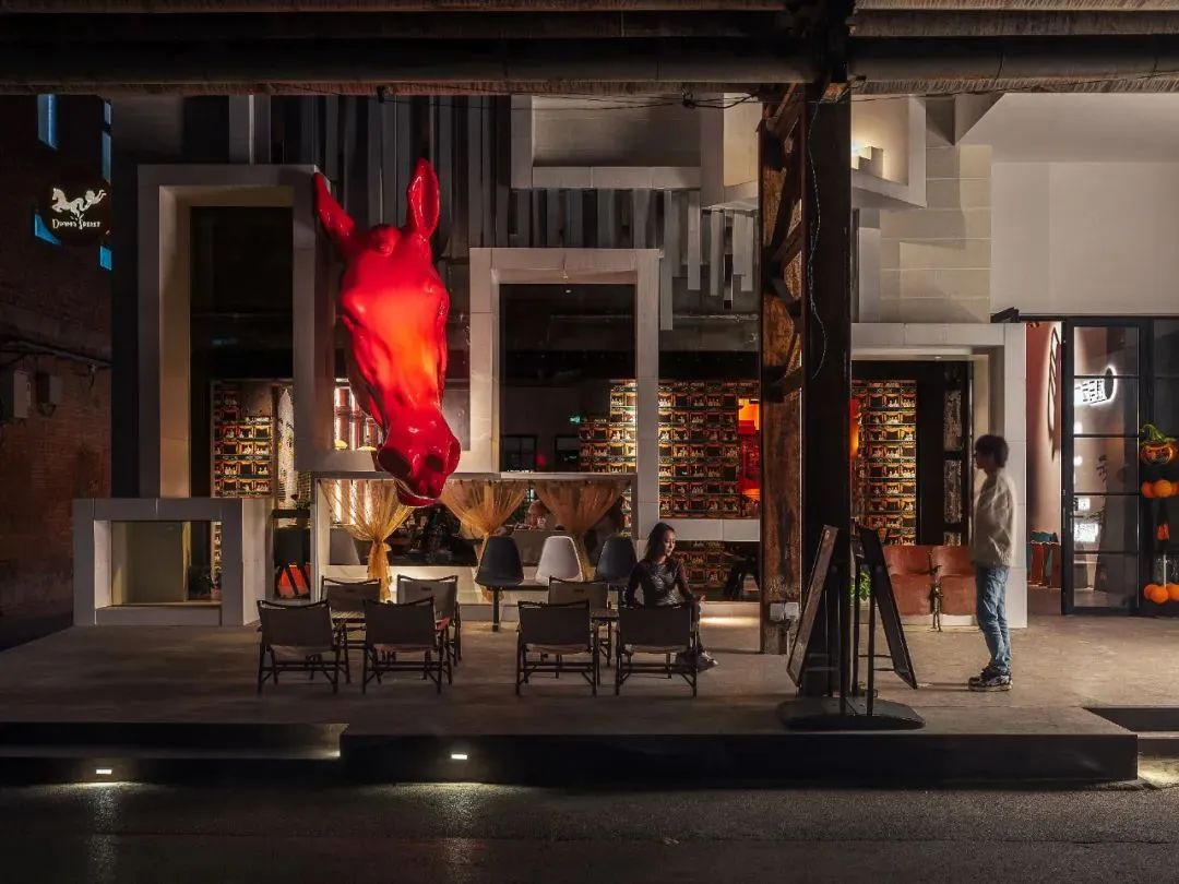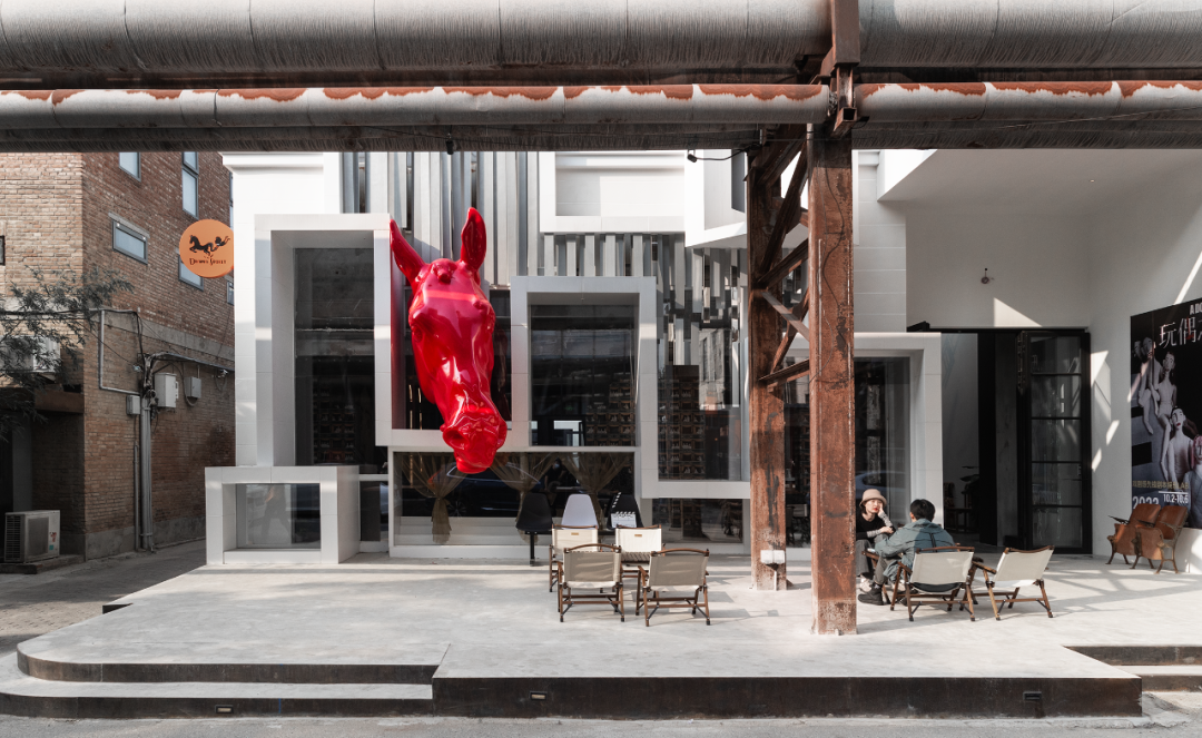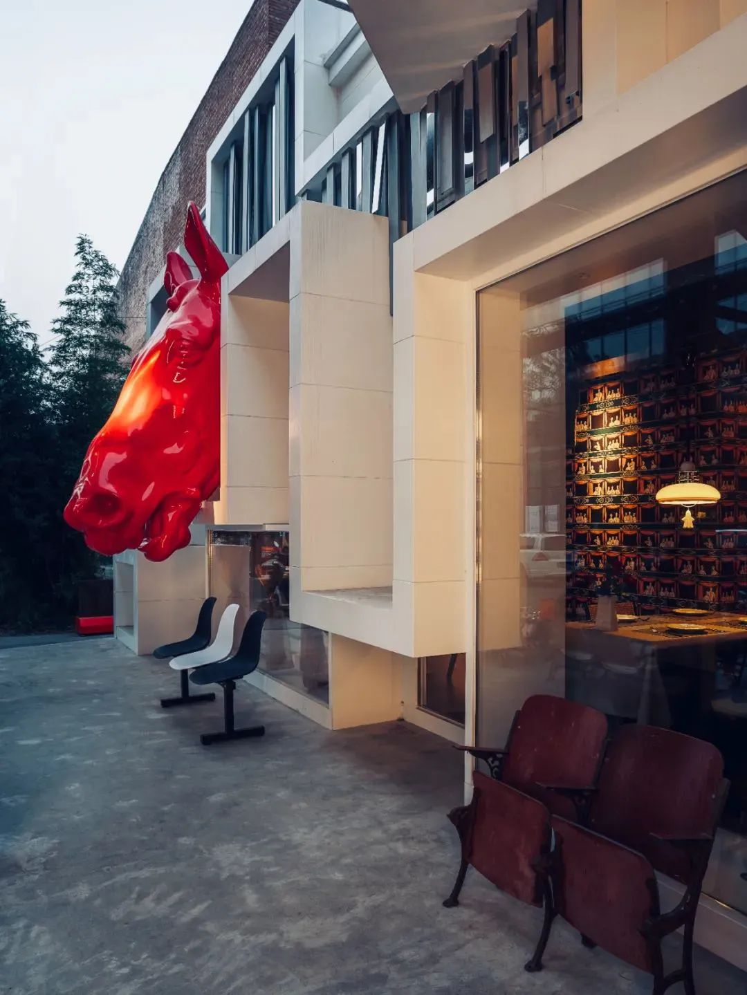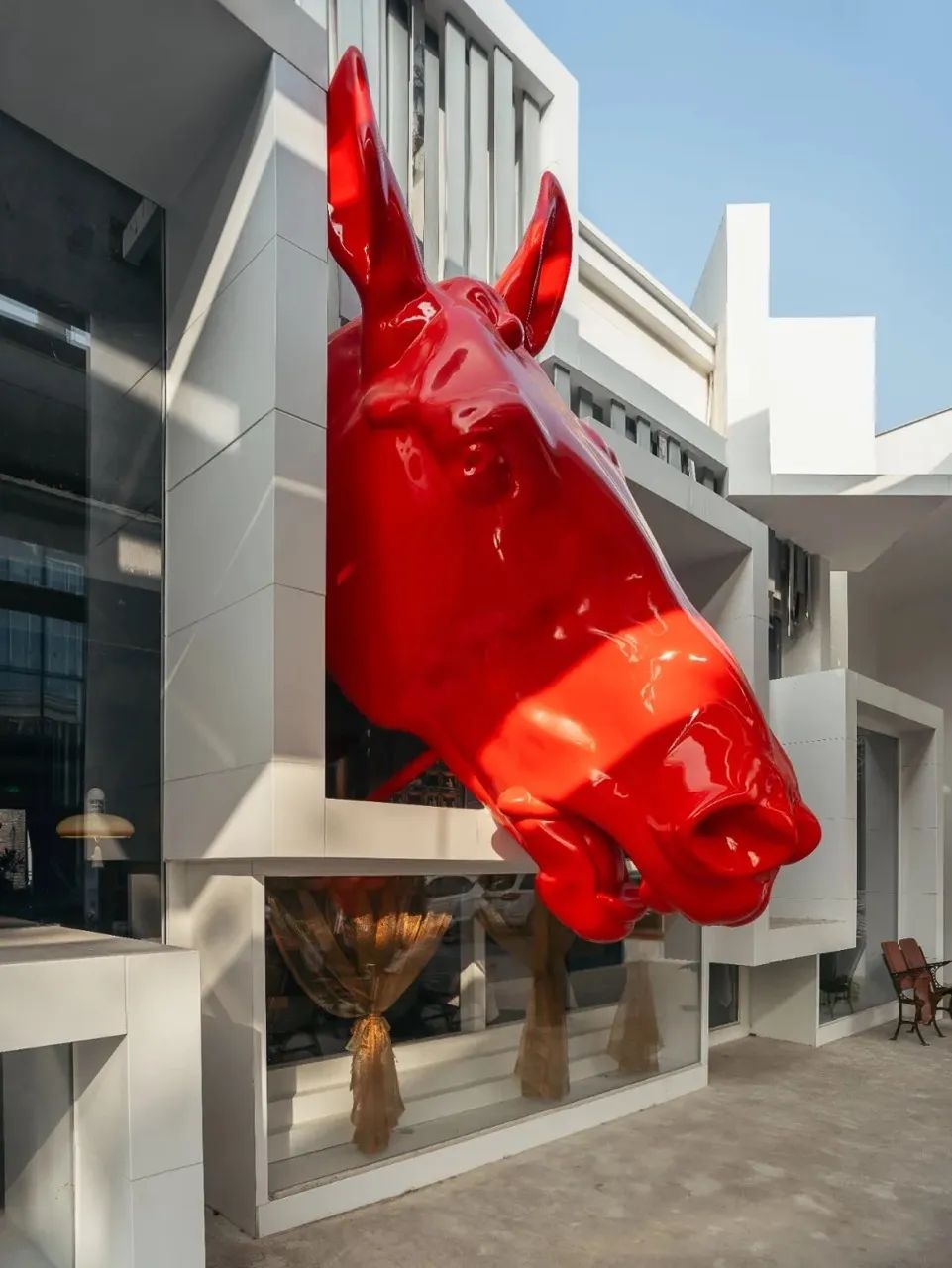 鉴于原建筑所处园区供热管道挤压形成的狭小空间限制,设计方案巧妙采用拽马品牌的标志性元素——红马头,使其从受遮挡的立面中凸显而出。