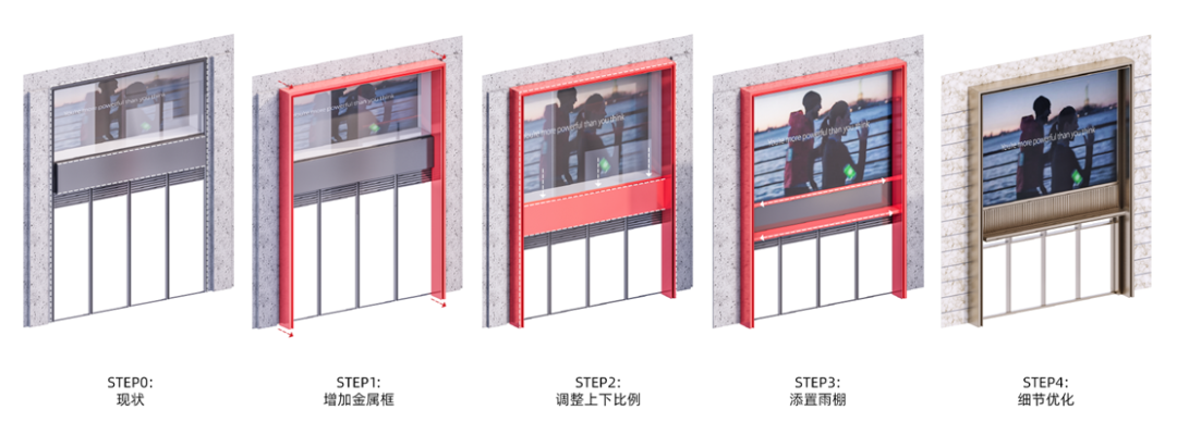 设计在原有高度范围内,通过调整一二层的比例关系,在满足店铺橱窗展示需求的前提下,尽量增加顶部广告和logo位的面积比例,中部则用以波浪金属板作为过渡。新增的通常雨棚,解决了规范的设置的需求同时也给广场客流提供了一片连续的避雨步行空间。改造后的首二层橱窗整体效果兼顾了实用和美观。