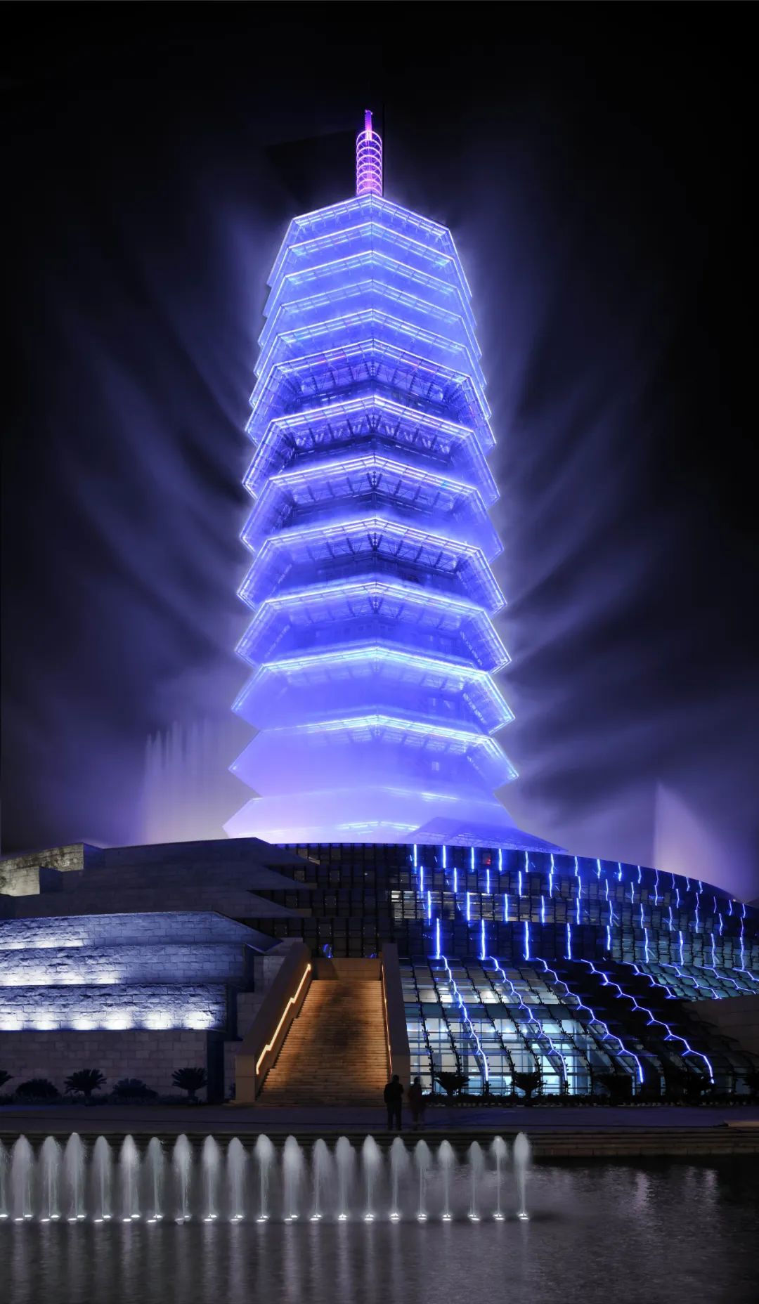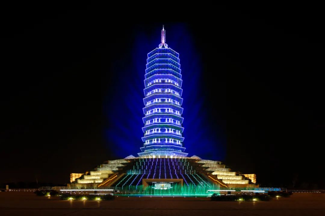 柔和的夜景照明及内透光设计,不停变幻基调,为水博馆披上一道炫丽面纱,美轮美奂——它是世界上唯一的百米立体喷雾宝塔。