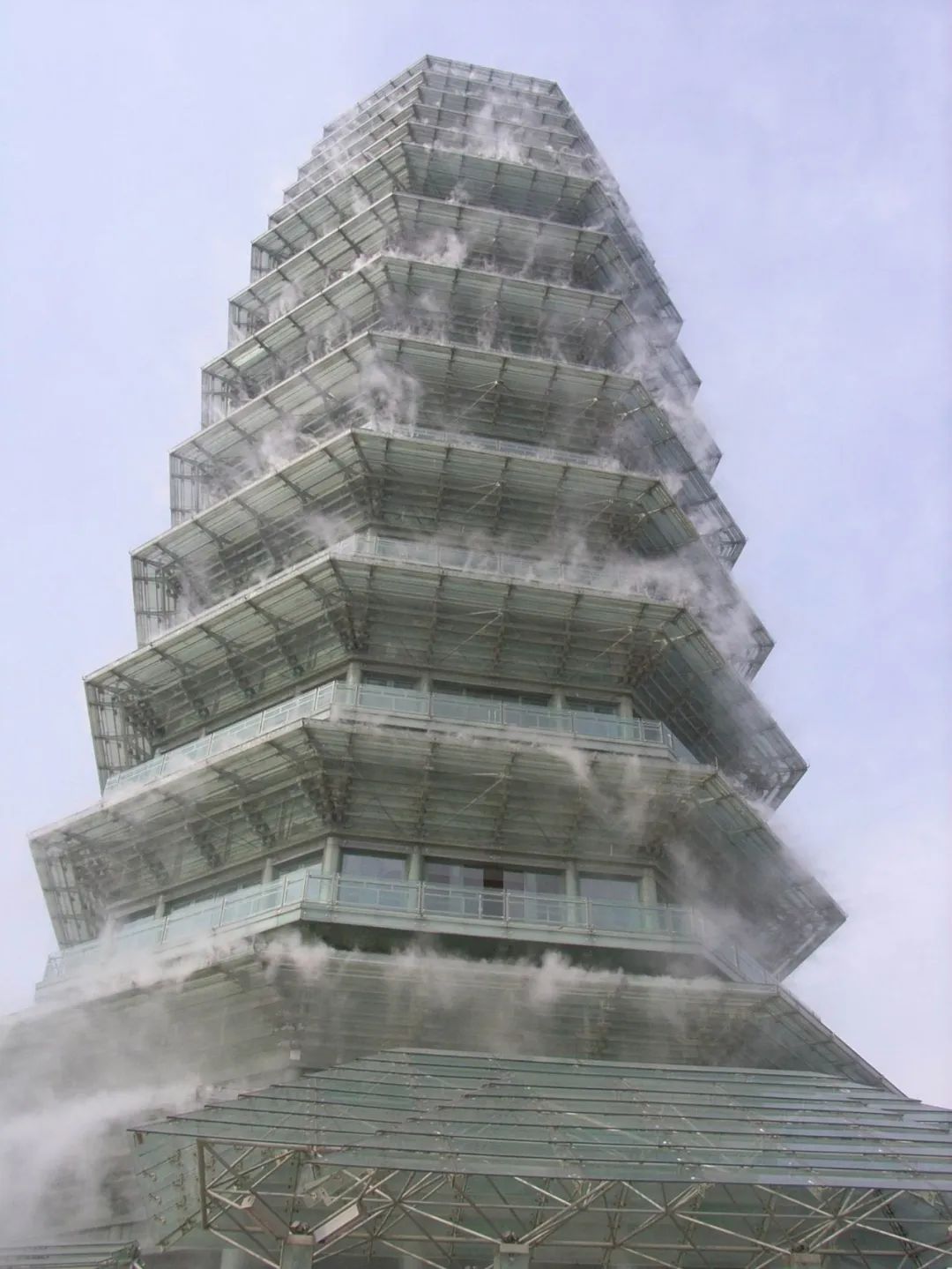 三面环水,水中之塔,一百多米全塔立体水喷雾,雾滴被设计师精准控制,从塔顶到底部雾质细密均匀。