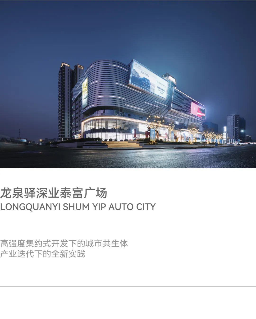汽车产业作为龙泉驿片区发展的主导产业,正加速向新能源、智能网联方向转型,依托链主企业、国际化合作平台和政策支持,构建“研发-制造-应用-出口”全产业链体系,目标是成为中国西部乃至全国汽车产业高质量发展的标杆。在此时代背景下,深业泰富广场作为全国首个以新能源汽车为主题的专业卖场,是集车城MALL、商业、办公、住宅于一体的综合性片区营造,致力于打造龙泉驿片区汽车产业新名片、新地标,塑造以主题性汽车展销为核心的一体化新体验商业综合体,并将发展成为西南地区新车发布首选平台作为远景。