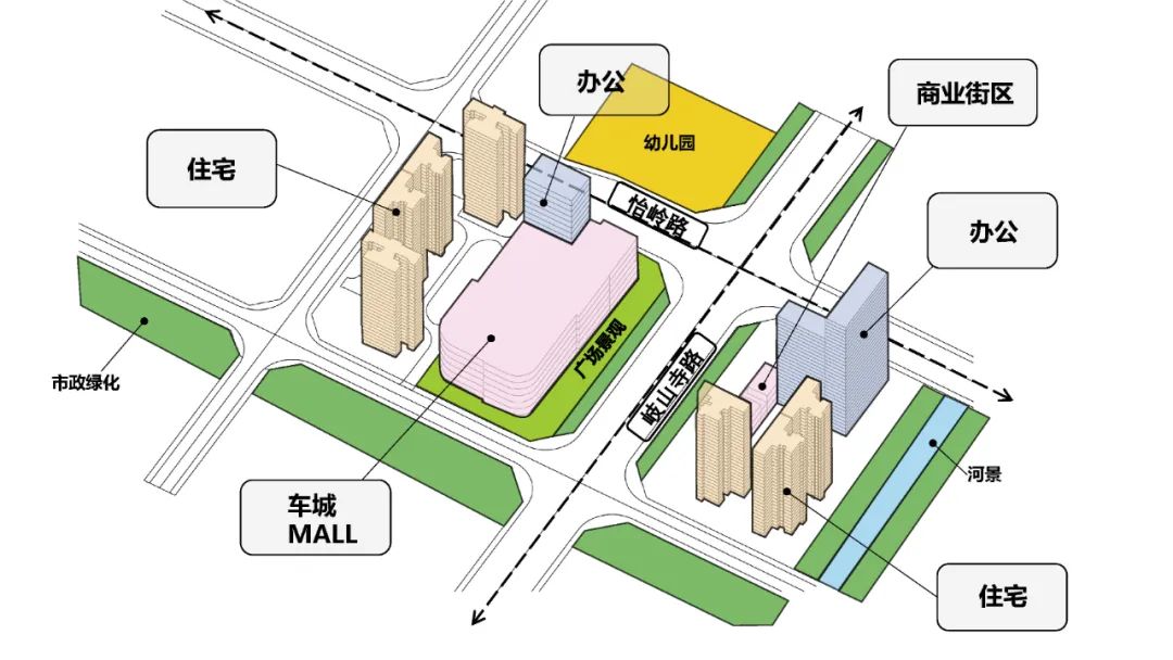 项目分为南北两个地块,总建筑面积约23.7万平方米。车城MALL位于北地块,临近城市干道及道路交叉口,拥有完整的城市展示面,便于独立运营使用。商办街区位于南地块,与车城形成空间上的互动,形成良好的城市界面和公共建筑组团空间。住宅组团位于相对较为私密地块两端,同时规划独立的组团景观空间和人车动线。