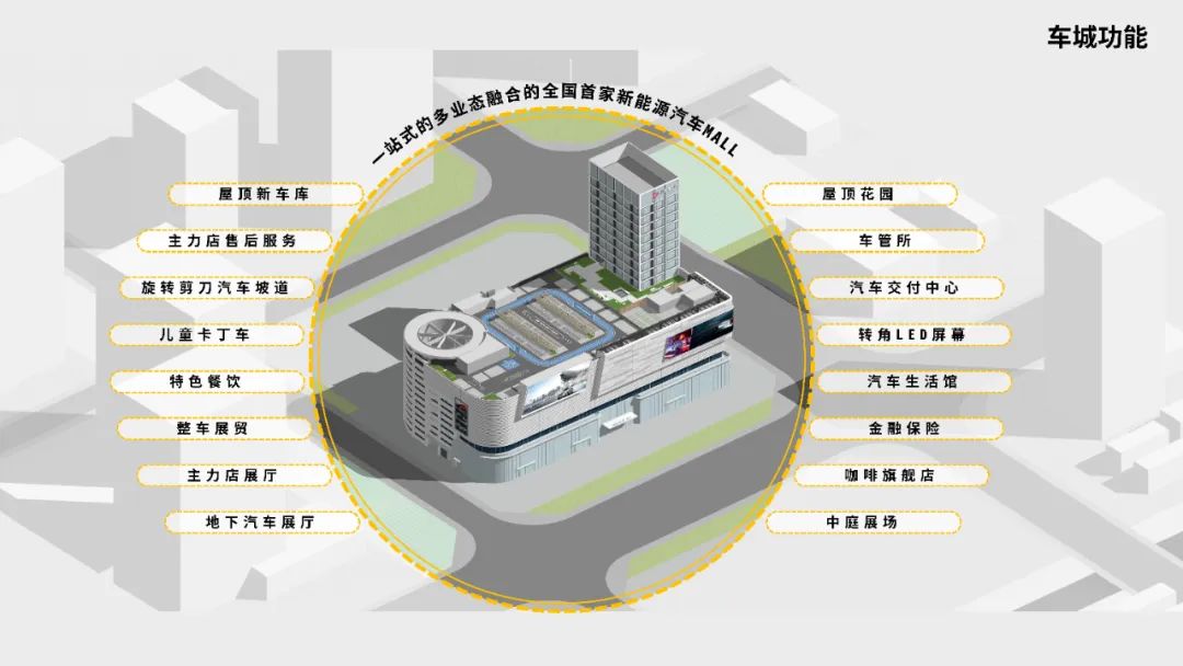 车城业态涵盖国内新能源汽车品牌及产业链延伸产品,是集新能源汽车展示、销售、维保、金融、保险、办证上牌、餐饮等一站式的多业态融合的全国首家新能源汽车MALL。