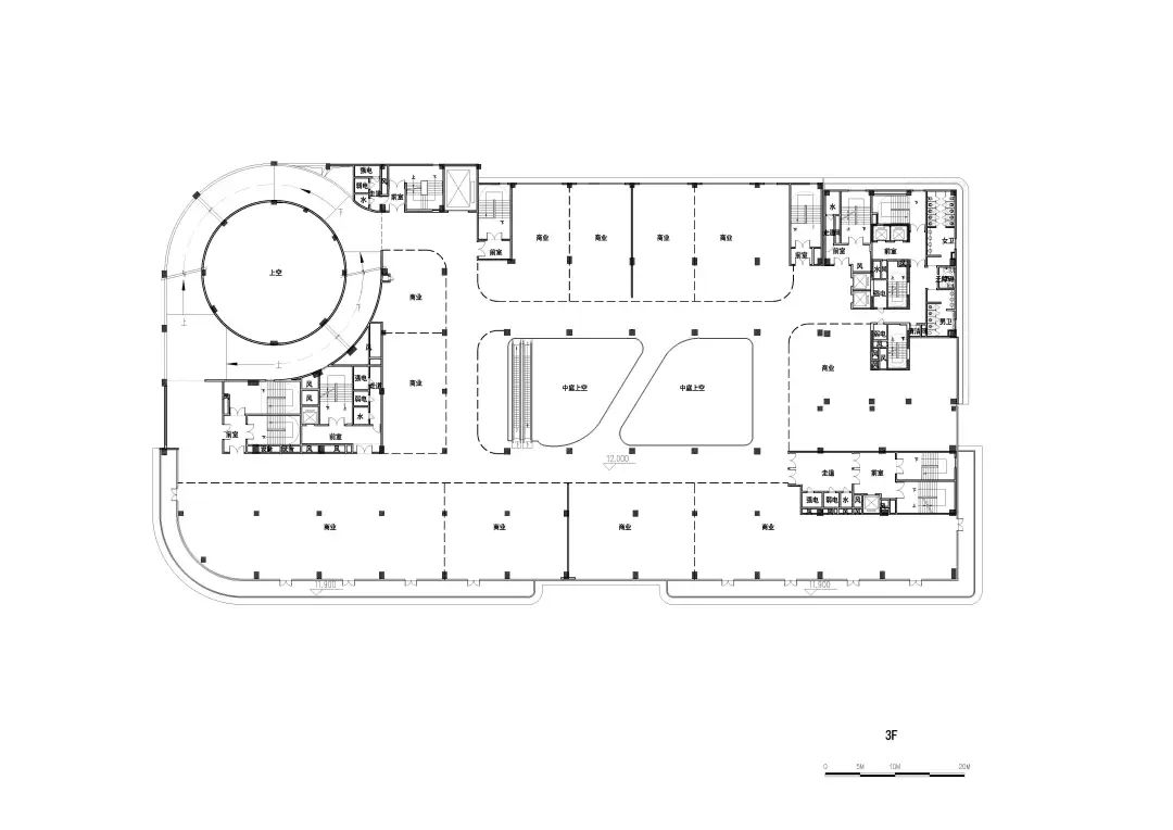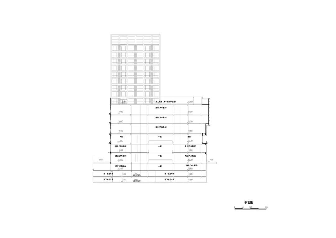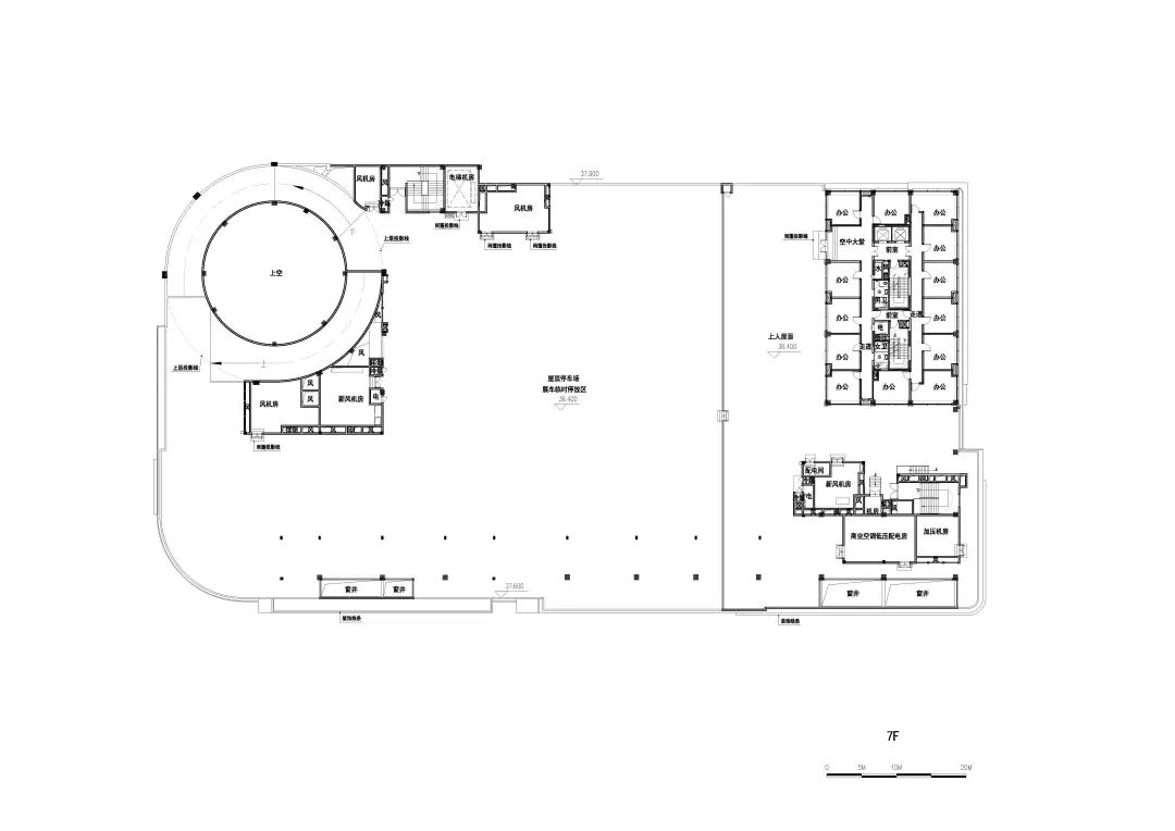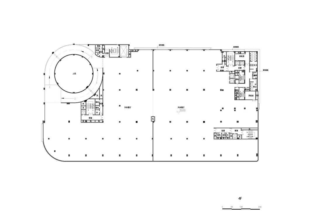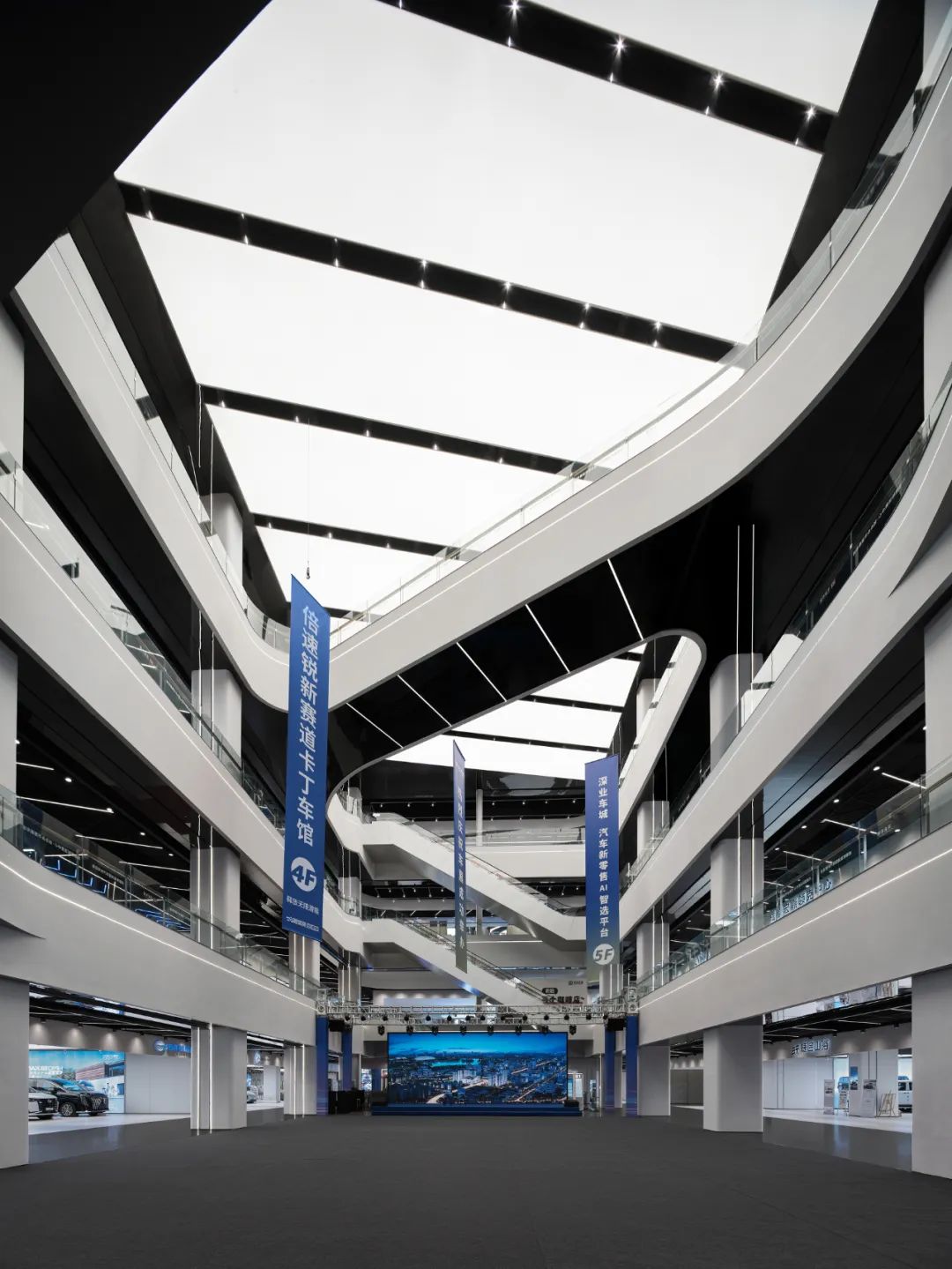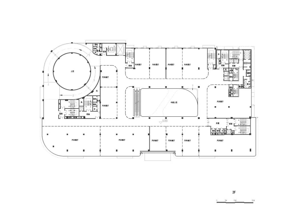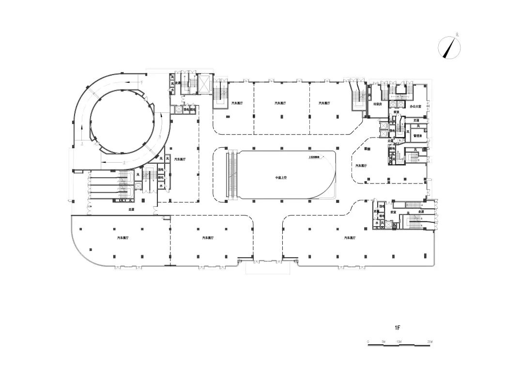 车城通过严谨的功能布局使建筑享有最大化的完整连续的展示界面,充分发挥主力店的商业价值;以“车的T台,城的show场”为理念打造主题性的中庭空间,可灵活举办汽车展销等一系列活动,提高商业活力;独特的双螺旋汽车坡道可实现汽车从地下车库到车城7F屋顶停车场层层可达,为汽车销售、展示、维保等运营提供良好条件;采用大柱网设计,2.7米宽的豪华车位最大限度地适应汽车行业的发展;同时,利用旋转坡道圆形中空空间,预留大量机械停车位条件,赋能远期运营需求;平面布局围绕中庭展开,形成高效的环形商业动线——我们力图通过一系列定制化的设计,打造一场永不落幕的车展秀。