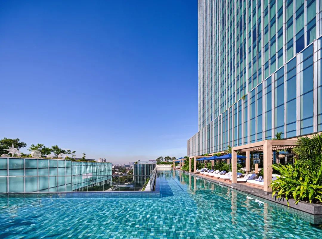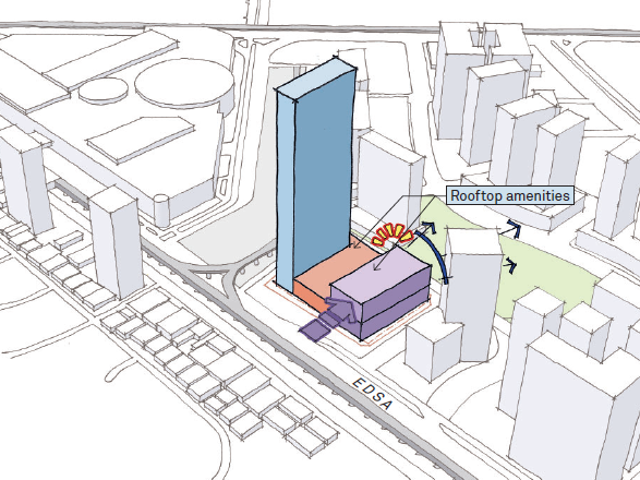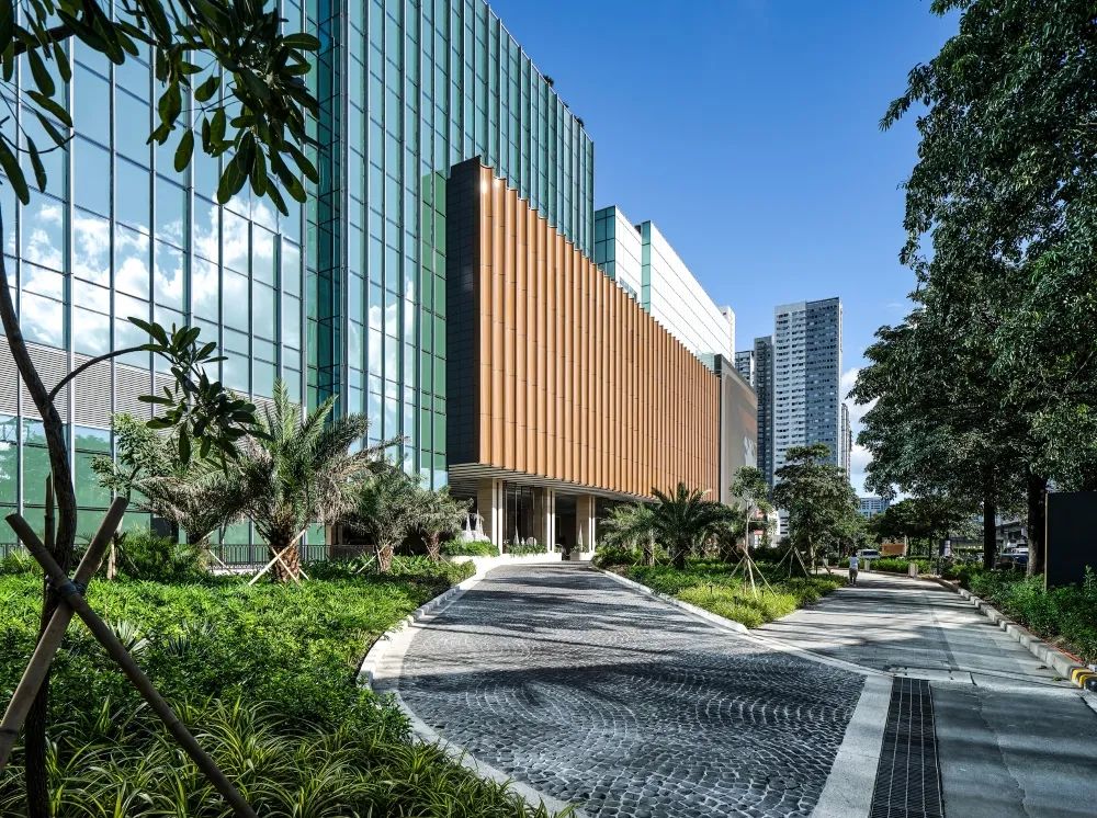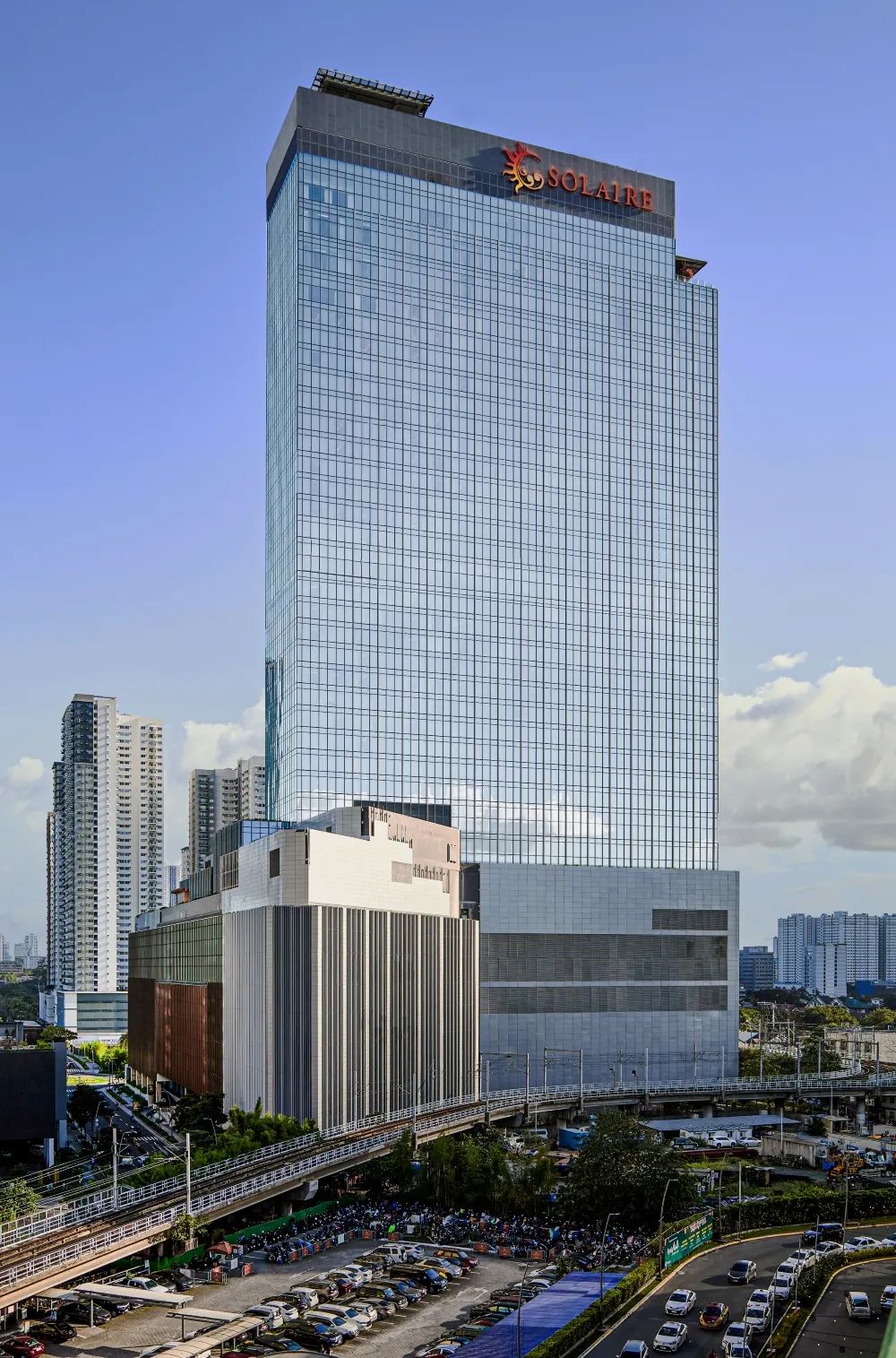 Solaire Resort North是位于奎松市中央商务区的综合度假胜地。作为马尼拉大都会人口最稠密城市的娱乐目的地,该项目将成为Vertis North开发区重要的发展引擎。Solaire Resort North is an Integrated Resort located in Quezon City's Central Business District. The development is an entertainment destination for the most populous city in Metro Manila and is poised to be a catalyst for the Vertis North Development.后勤区街景View from Service Wing项目位于Vertis North总体规划区域,这里可便捷通达德洛斯桑托斯大道(EDSA)主干道。同时,周边公共交通便捷,地处捷运奎松站和北站之间的沿线路段。The site of Solaire Resort North is part of the Vertis North Master Plan Development and offers easy access via the main road of Epifanio de los Santos Avenue. The site is also easily accessible via public transport being conveniently located along the MRT line, between Quezon Station and North Station.总平面图Site Plan项目位于奎松市地价最高、开发密度最大的三角公园区(Triangle Park District),占地15,676平方米。团队致力于打造一座极具标志性、优雅且隽永的建筑,设计充分利用地块面积,构筑出充满活力的世界级地标。Solaire Resort North is situated in the Triangle Park District which boasts the highest land value and highest development density in Quezon City. On a plot of 15,676 sq m, the development is envisioned as an iconic, elegant, and timeless design that maximises the site footprint, resulting in a vibrant and world-class landmark development.项目街景Street View of Solaire Resort North德洛斯桑托斯大道一侧入口 Entrance from Epifanio de los Santos Avenue这座38层高的建筑内设有:拥有526间客房的五星级酒店、空中酒吧、池畔酒吧、各式主题餐厅、13,150平方米的博彩空间、健身房及水疗中心、儿童设施、家庭及成人泳池、1,800平方米的宴会厅及会议设施,以及户外活动空间和中庭空间。建筑布局与设计亦融入了风水理念。Solaire Resort North offers a 5-Star Hotel with 526 keys, sky bar, pool bars, various themed restaurants 13,150 sq m of gaming space, gym & spa, children’s facilities, family and adult pools, 1,800 sq m ballroom & meeting facilities, and an outdoor event space and atrium space in the 38-floor building. The design of the building also incorporates Fengshui philosophy in its layout and arrangement.项目的主要设计挑战在于如何在相对紧凑的地块内容纳复杂的混合功能,同时提升连通性与用户体验。最终设计方案以功能为导向,通过差异化的立面处理展现错落有致的体块组合。The main design challenge of Solaire Resort North was to accommodate a complex mixed-use programme into a relatively small site while enhancing connectivity and user experience. The result is a programme-driven design featuring an interlocking massing represented by different façade treatments.项目紧邻铁路线,正面和侧面均退线3米以协调周边基础设施。裙楼区域在满足退线要求的前提下实现最大化利用,共设3层,其中首层为商业零售店面,并整合了车辆环线及落客区,为访客提供便捷体验。Situated directly adjacent to the railway, the development has a setback of 3 m on the front and sides to accommodate the surrounding infrastructure. The podium area is maximised based on the site setback, featuring 3 floors with the retail frontage at level 1, as well as integrated vehicular circulation and drop-offs to provide a convenient journey to visitors. 场地限制Site Constraint最大化裙楼面积 Maximising the Podium Footprint酒店塔楼体量向裙楼延伸融为一体,高耸挺拔的形象提升了项目的昭示性,使其成为区域地标。塔楼朝向经过精心设计,以减少西晒影响并优化各方位视野。宴会中心置于裙楼另一端,为活动布置提供了最大化空间,同时在裙楼屋顶的平台层形成了核心的公共及活动空间。Integrating the towers into the podium, the extended height of the hotel tower volume adds to the visibility of the development, with its sheer height making it a landmark in the area. The tower was also oriented to minimise exposure to the west-facing sun and optimise views on all sides. The convention centre was placed on the opposite end of the podium to maximise constructability. This also creates a central area for communal and event spaces on the podium deck.塔楼体量布局Tower Volume会议及宴会布局 Placement Convention Block Placement为削减体量感,塔楼体块以阶梯式形态向裙楼方向层层退叠。这一形态不仅与周围的开发项目形成更好的对话,也创造出更多的露台及屋顶空间。设计在公共空间布满葱郁的绿植,在繁华的三角公园片区营造出一片都市绿洲。首层引入LED媒体墙,塑造项目标识性,并为从德洛斯桑托斯大道而来的访客提供雅致的到达体验。To reduce the volume, the massing of the tower has been fragmented towards the podium in a cascade. This creates a better dialogue with the surrounding developments, while allowing space for more terraces and rooftop spaces. These communal spaces are finished with lush greenery to create an urban oasis amid the bustling Triangle Park. On the ground floor, the introduction of an LED media wall creates a sense of identity and an elegant arrival experience from Epifanio de los Santos Avenue.体量分割Mass Fragmentation创造独特形象Creating Identity位于六层的游泳池和休闲区Swimming Pool and Recreation Areas on the 6th Floor酒店主塔楼立面采用玻璃幕墙,设计简洁现代,在城市天际线中脱颖而出。在此基础上,塔楼立面设有竖向装饰条,为酒店住客提供充足遮阳,并提升整体美学效果。The façade of the main hotel tower is finished with a glass curtain wall that delivers a 