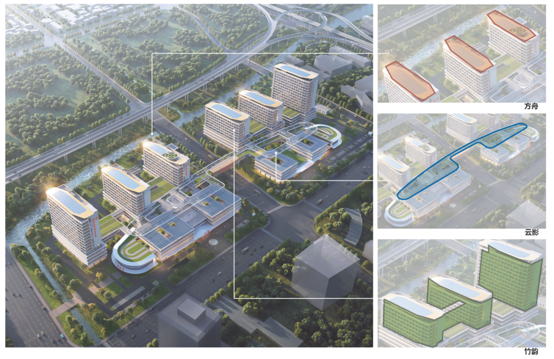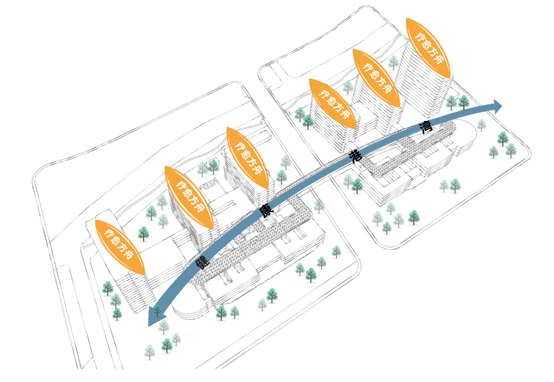 设计团队由此汲取灵感,将核心建筑群塑造成停泊于宁静港湾的“疗愈方舟”。以“济世方舟,扬帆云间”为设计概念——“云间”是古代松江的别称,故本项目从“方舟”获得灵感,主要建筑如同一艘艘疗愈方舟停靠在疗愈港湾,寓意着岳阳医院以济世方舟形态驶入新时代松江,在科技与历史交融的云间扬帆起航,为人民提供高质量健康服务。