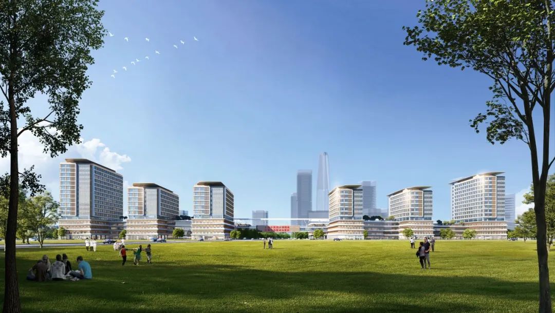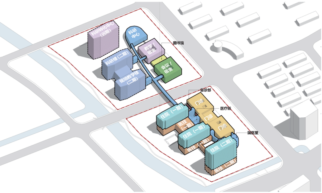 “如何满足分期建设要求、使得整个院区有序生长、和谐统一?”——在分期建设的挑战下,集约高效的用地分区成为解题的一把“钥匙”。我们对各期用地进行合理划分,将用地划分为一期、二期及远期用地。一、二期病房楼、二期科研转化中心、远期规培教学中心等高层建筑于场地西侧布置,一共六栋塔楼分期拔地而起,如同六艘“疗愈方舟”,最终共同打造富有标志性的医疗建筑组群!