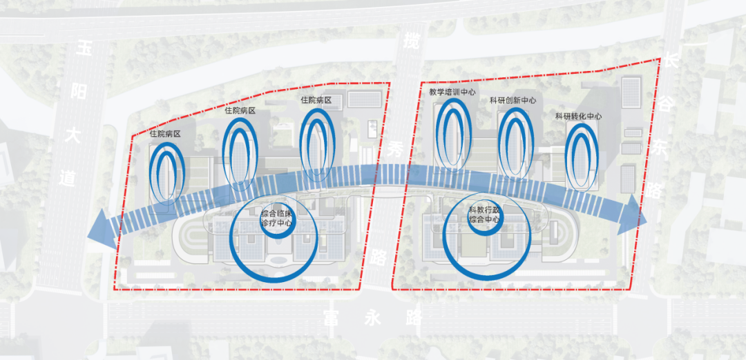设计团队根据本项目各大医学中心的规模及定位,以“功能模块化、流程体系化”为核心策略,将各大中心中的门诊、急诊、医技、教学、科研等各个功能用房模块化设置,并分别通过一条门诊医疗街和一条弧形的医技医疗街串联起来,构建一套立体高效的医疗流程体系。