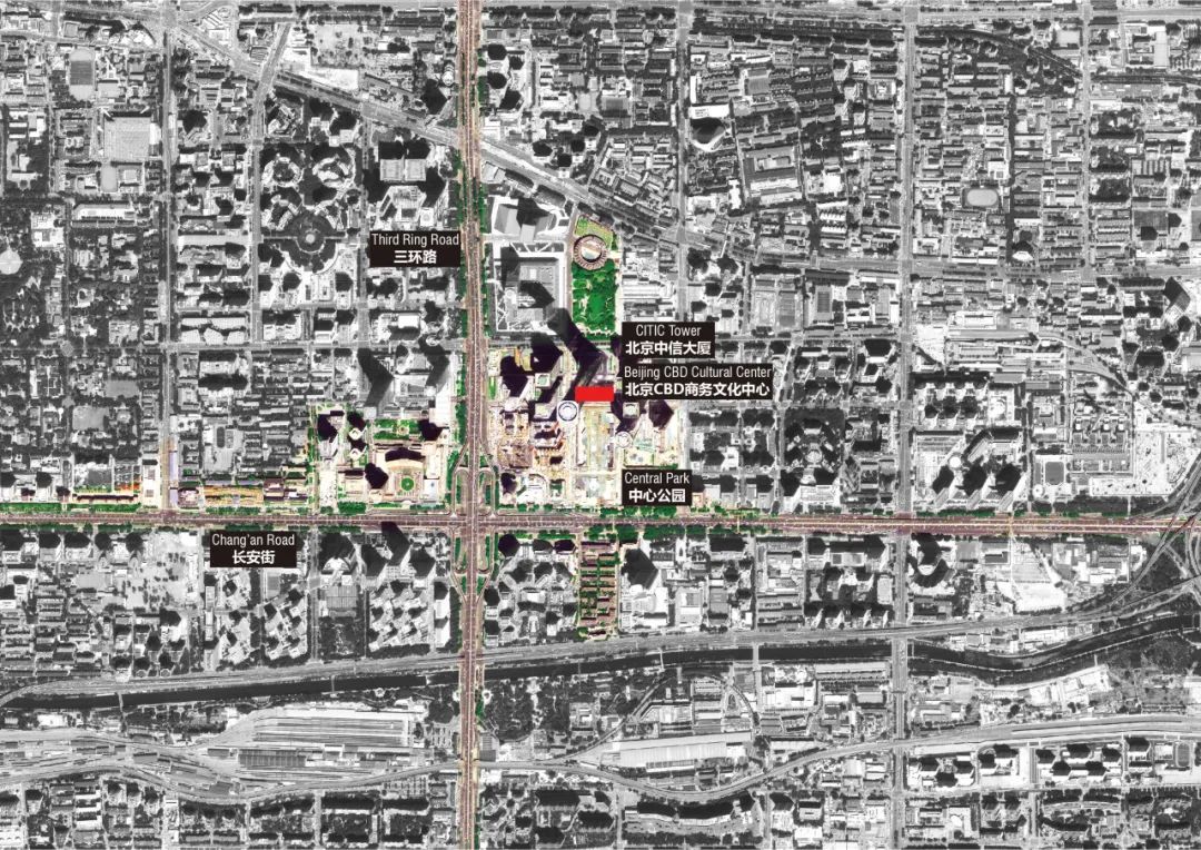 项目位于北京CBD主轴线中段,距天安门东侧仅五公里,南临中心公园,北望北京第一高楼——中国尊。塔楼与绿地之间的过渡带,被赋予了极为克制的尺度限制——建筑高度不得超过41米。在这片寸土寸金的区域,文化中心并未试图“比高”,而是以“比轻”的策略,选择了城市对话而非视觉争夺。