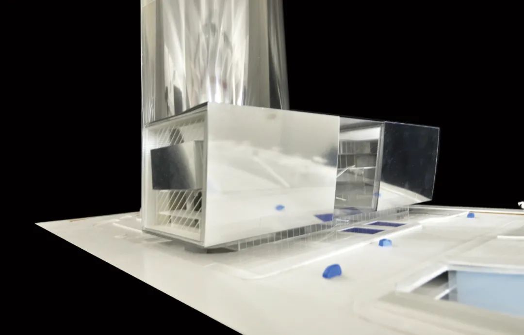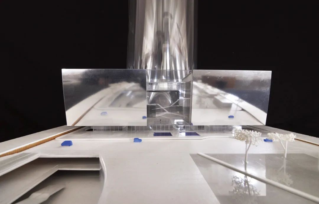 建筑由两座镜面“文化容器”构成,中间以通透的玻璃中庭串联,整体体量向南倾斜9度。这一设计策略,首先是在姿态上向南侧中央公园敞开,最大程度地将绿色景观纳入镜面立面之中。同时,这一角度亦有效避免了垂直幕墙常见的光污染问题——通过倾斜设计,建筑将阳光反射控制在可接受范围内,降低了对周边建筑的干扰,使其成为城市肌理中的温和参与者。