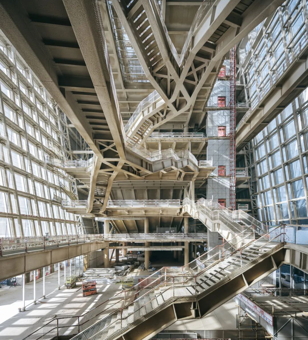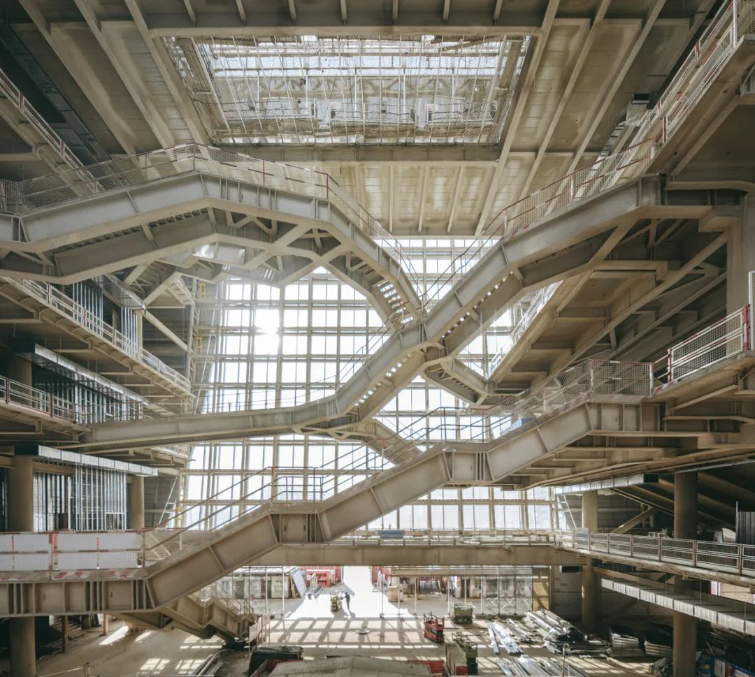 所有垂直交通系统——电梯、楼梯、坡道与观景连桥——集中布置于中庭通透体量中,不仅提升效率,也将建筑结构与人流动线展现为“可被观看的空间剧场”,使公共活动本身成为建筑叙事的一部分。
