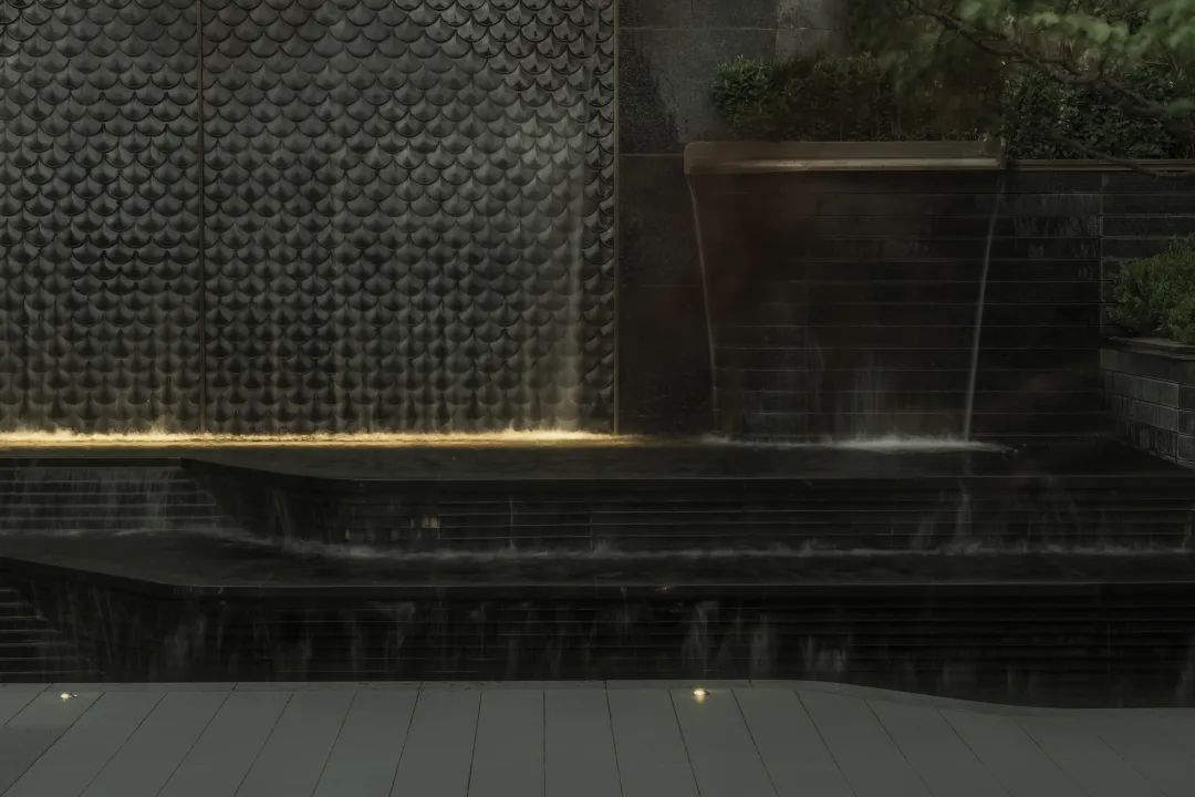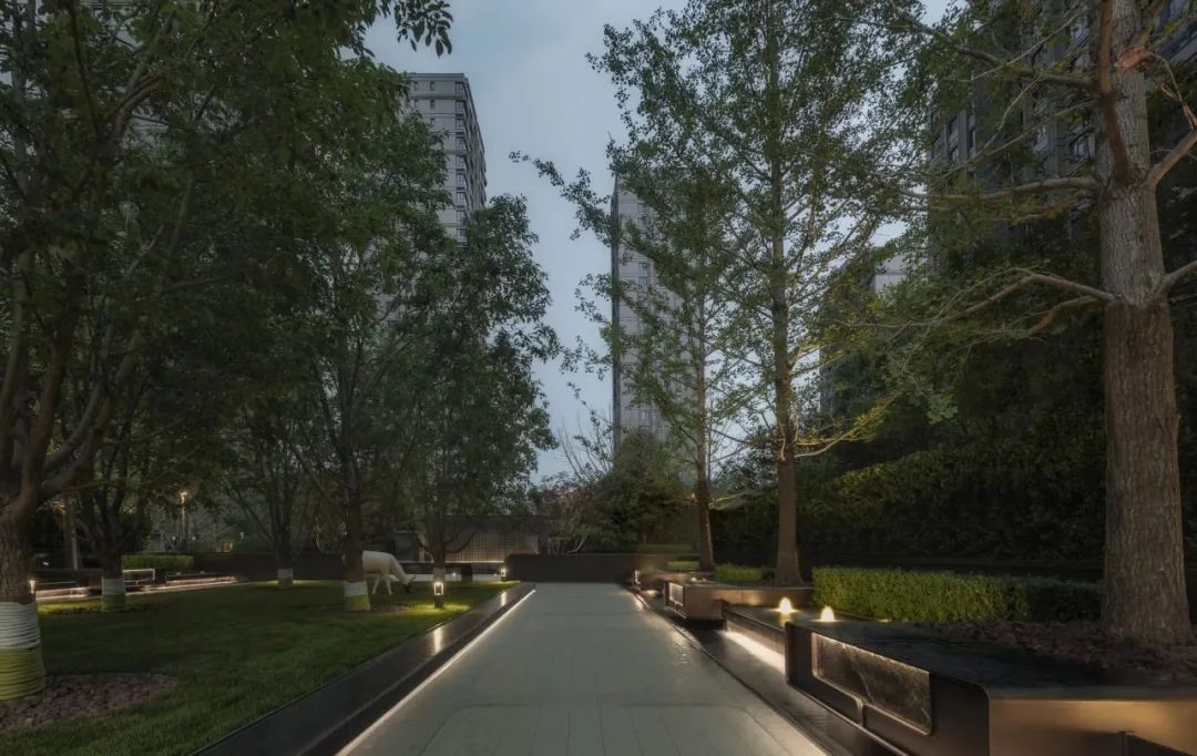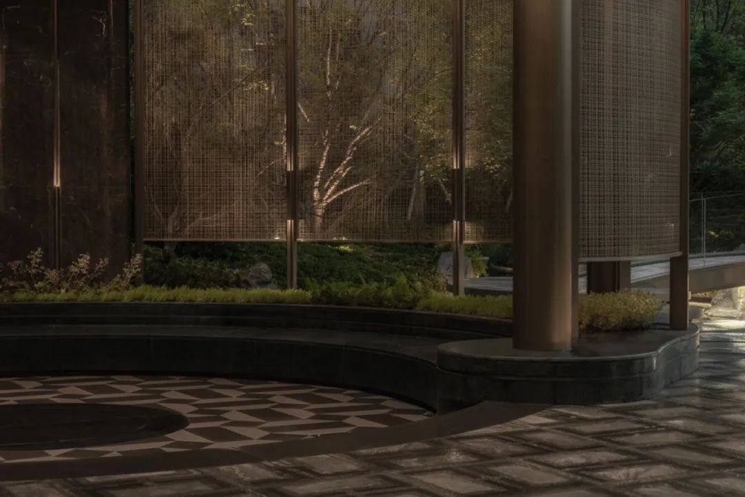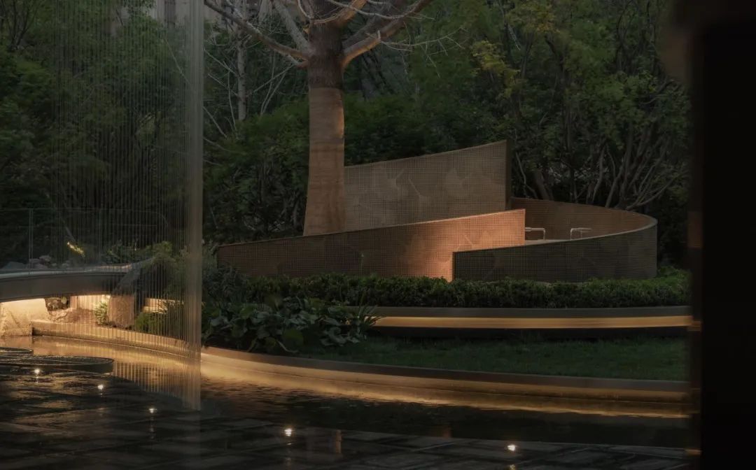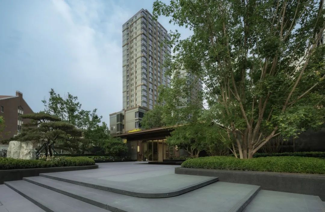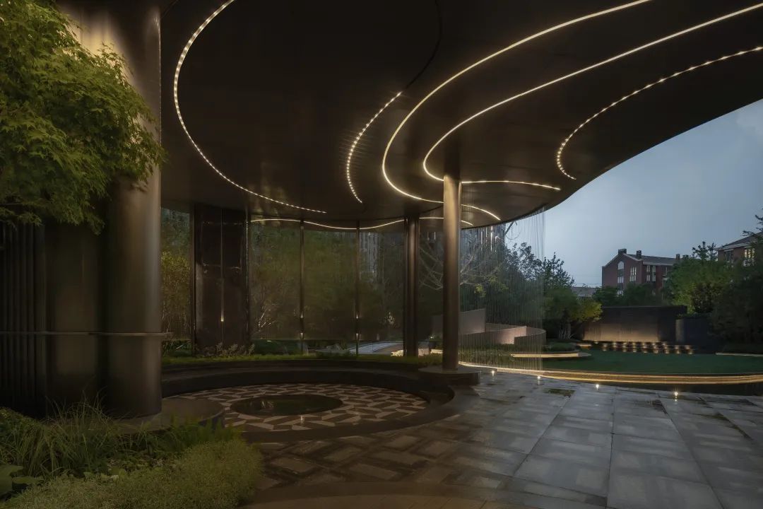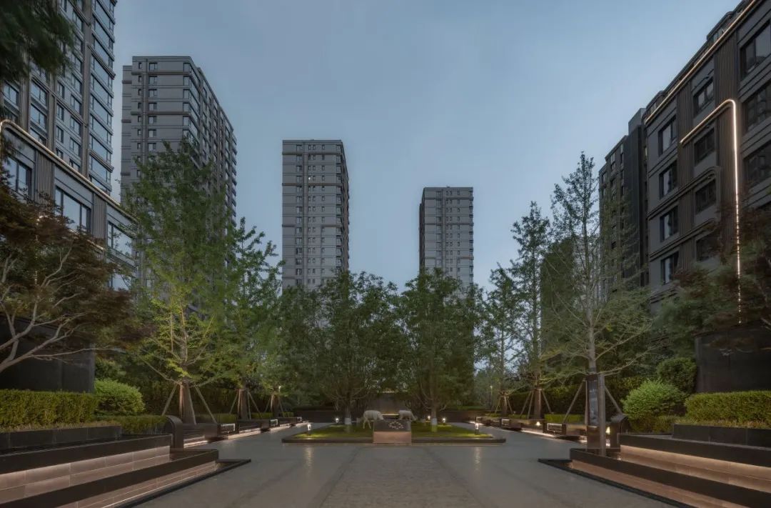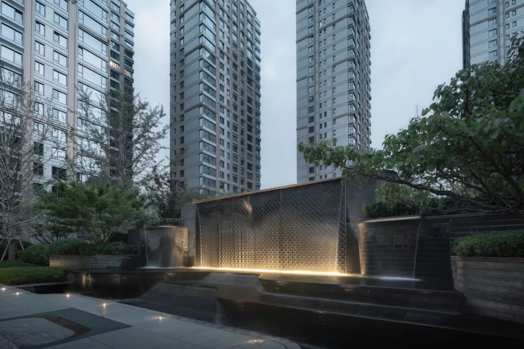 酒店式入口以「琼枝」为意象,景石卧波,水韵天成。轴线铺装如大地脉络延伸归家路径,台阶与种植池层叠递进。