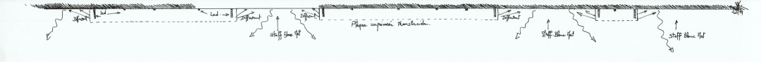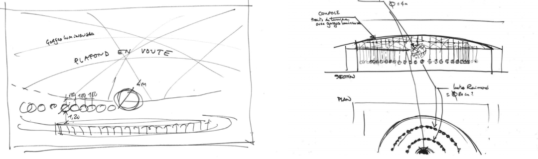 光从中间圆形主花灯依次层叠散开 , 如同天光从中央洒下 , 外围的筒灯如星光般散落 , 使得整个天花与自然的天空宛若一体 . 光聚集在中间 , 层层减弱的同时 , 四周的墙面再次加强 , 石材的墙面宛如山体的页岩 , 又如同展开的竹简 . 描绘了一个又一个有关家国的记忆和文明传承的故事 , 也阐明了主题“和合共生 , 天人合一”的自然宇宙观。