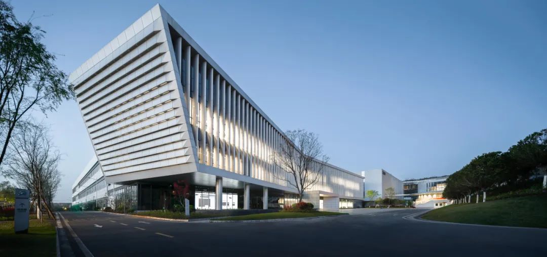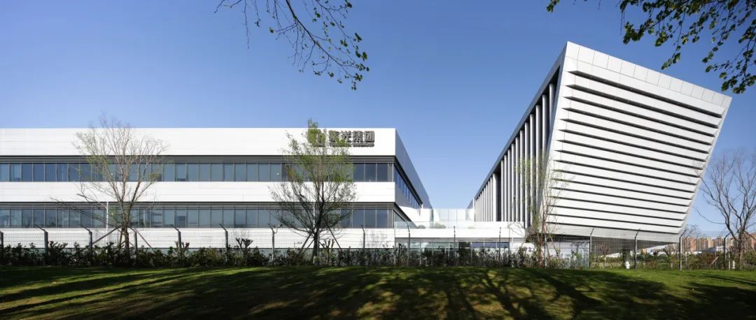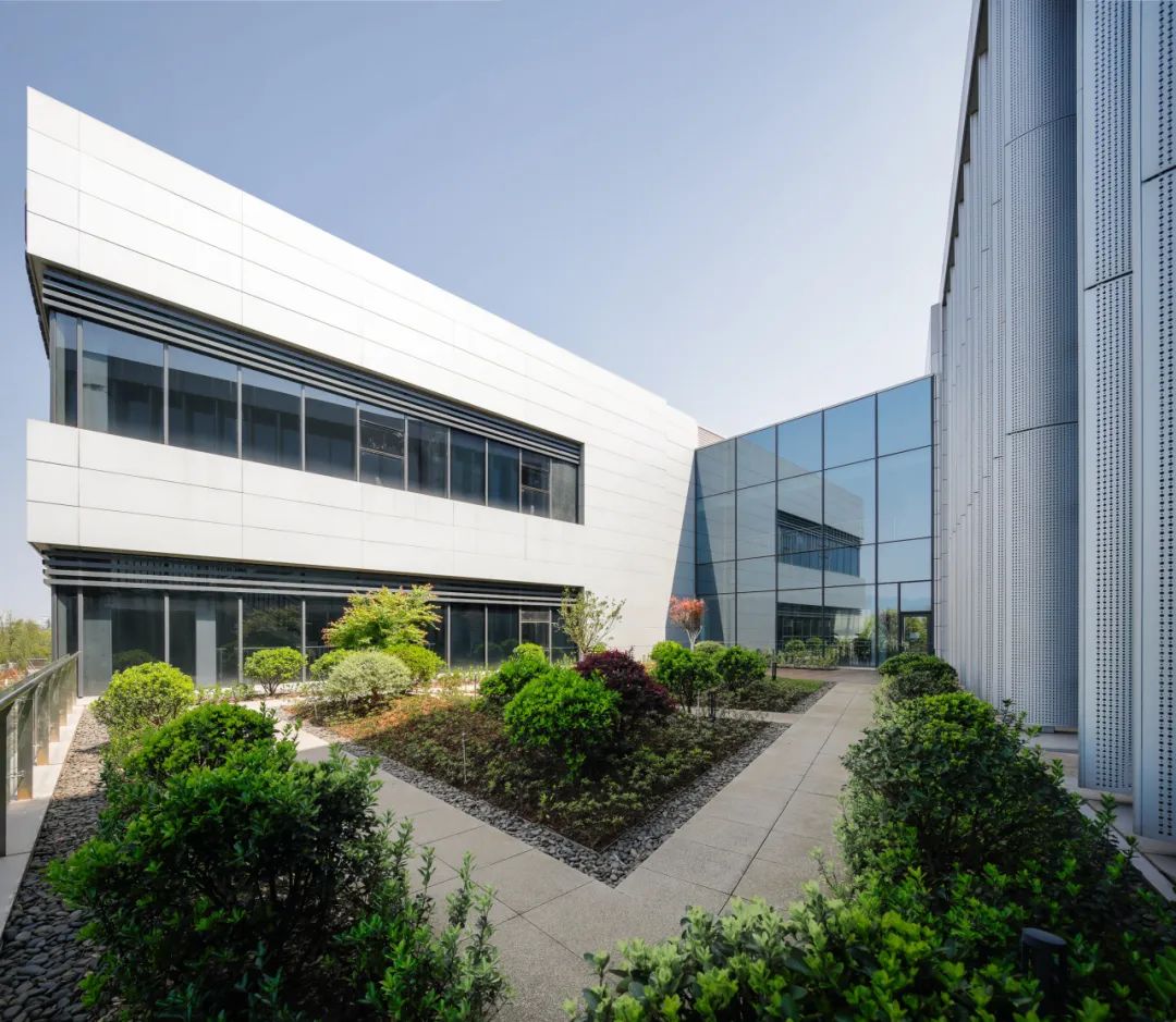 一期的核心景观位于用地南侧的三角形地块,通过入口广场,景观水池,空中花园,地景式建筑屋顶草坡等设计元素形成一期厂区的景观视觉中心。车间办公楼立面采用特定角度梭形截面铝穿孔遮阳板,有效阻挡额外直射光线和西晒。