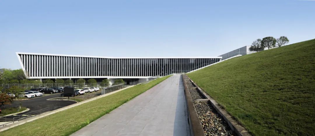 整个布局因地制宜,入口空间形态的塑造围绕入口广场和停车区,将办公楼布置于用地最佳朝向,员工餐厅与活动中心整合为地景式建筑,结合西低东高的地形走势,通过由东向西层层跌落的屋顶景观,与办公楼形成空间呼应,形成富有标识性的场所感。