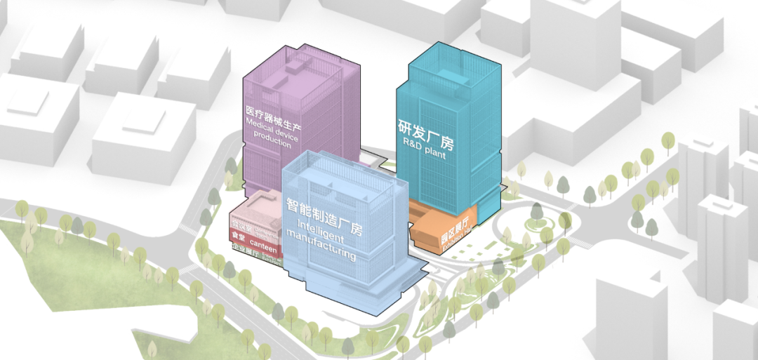 项目整体规划与片区功能相结合,借助面向林家坝TOD一侧的最优城市界面,布局具有标志性的高层产业研发楼宇,裙楼规划为项目展示中心及研发样板区。在用地的西侧和南侧,结合独立且完整的货运流线,设置高层工业厂房。