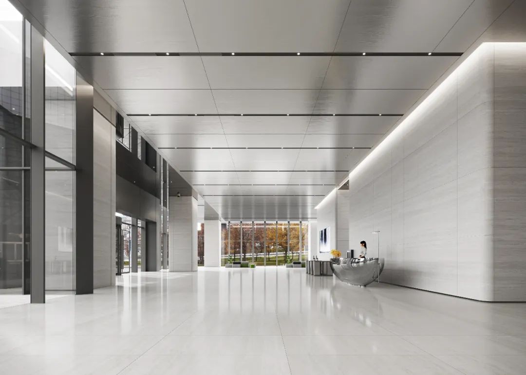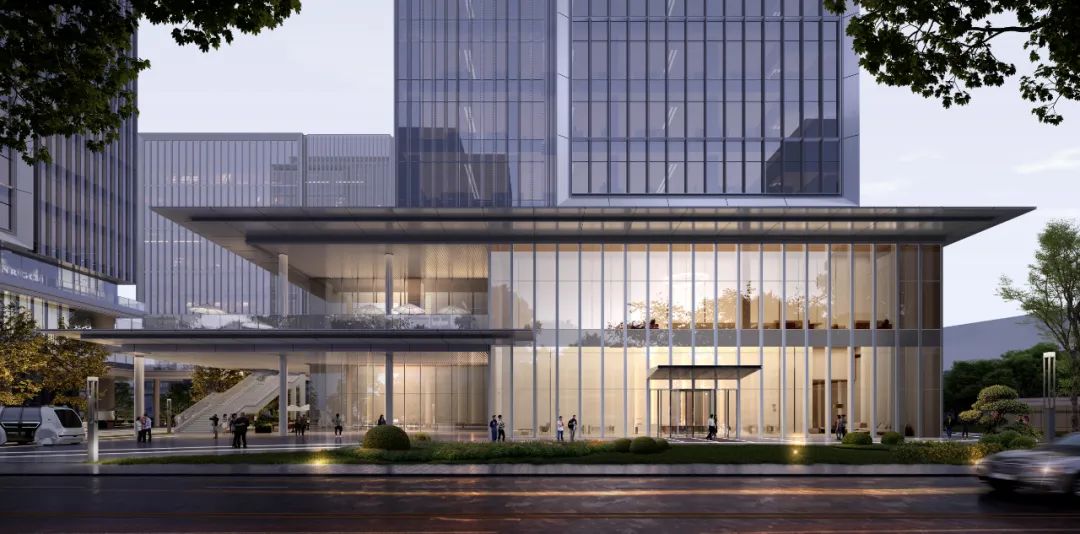 幕墙在模数化的框架内形成富有韵律节奏的虚实变化,既确保了内部空间的采光与视野,又为城市街道营造出具有工业精密感的视觉边界,最终构建出一种兼具现代性、秩序感与工业质感的城市视野。