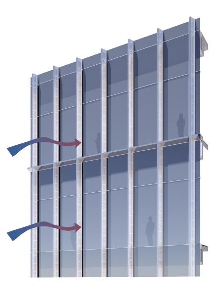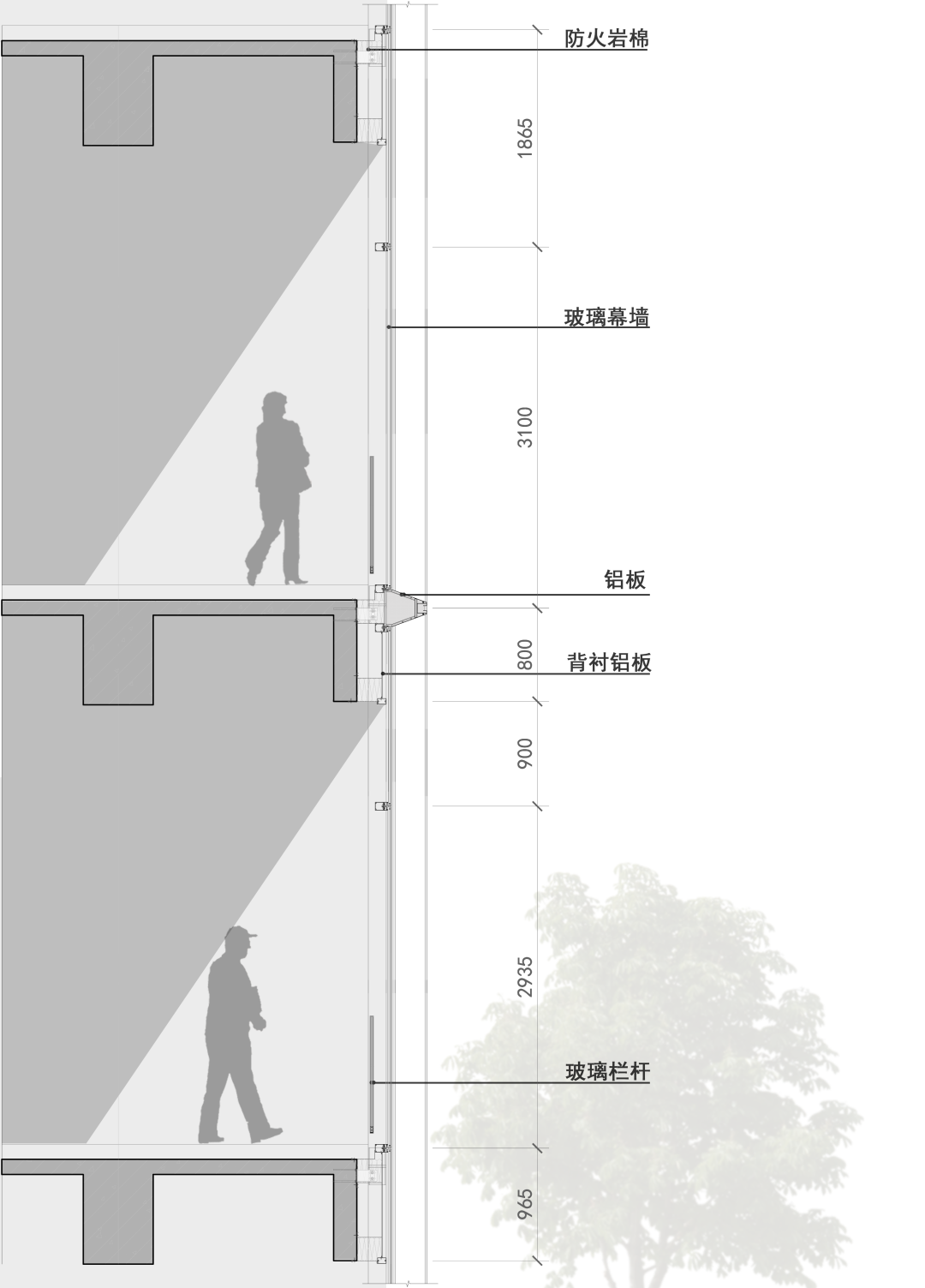 幕墙设计以竖显横隐的幕墙体系为主,在强化立面整体构成的同时,巧妙的整合开启扇。开启扇设计结合幕墙构造与热工需求,通过节点精细化处理实现隐蔽化,确保立面的简洁统一,同时保证室内空间对于自然通风的需求。大面积玻璃幕墙的应用,充分引入自然光,有效减少日间人工照明,提升室内空间的舒适度与通透感。