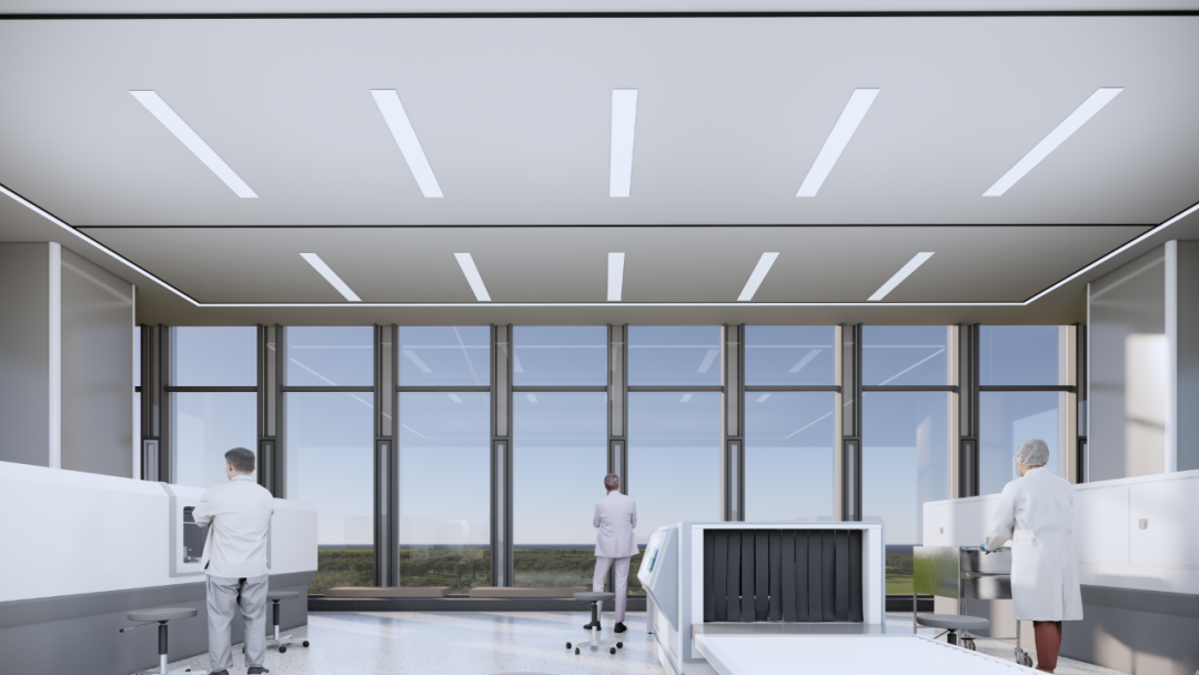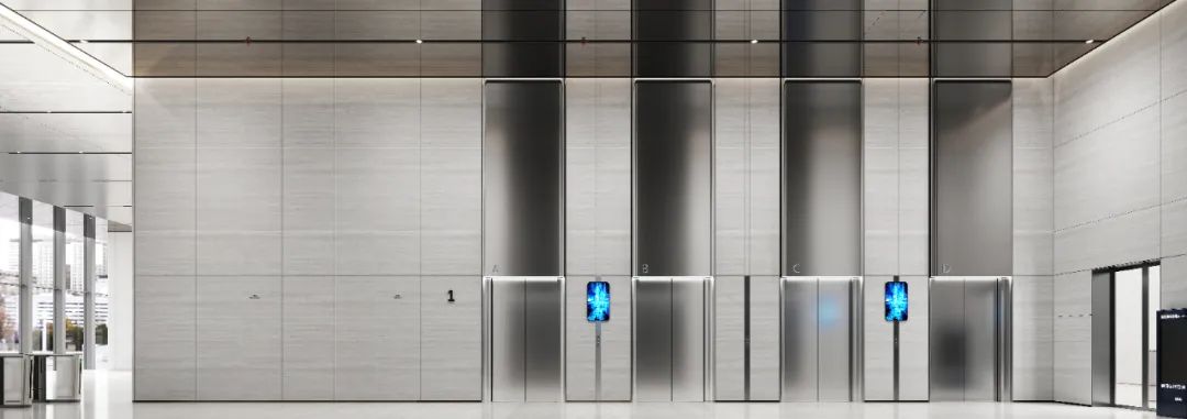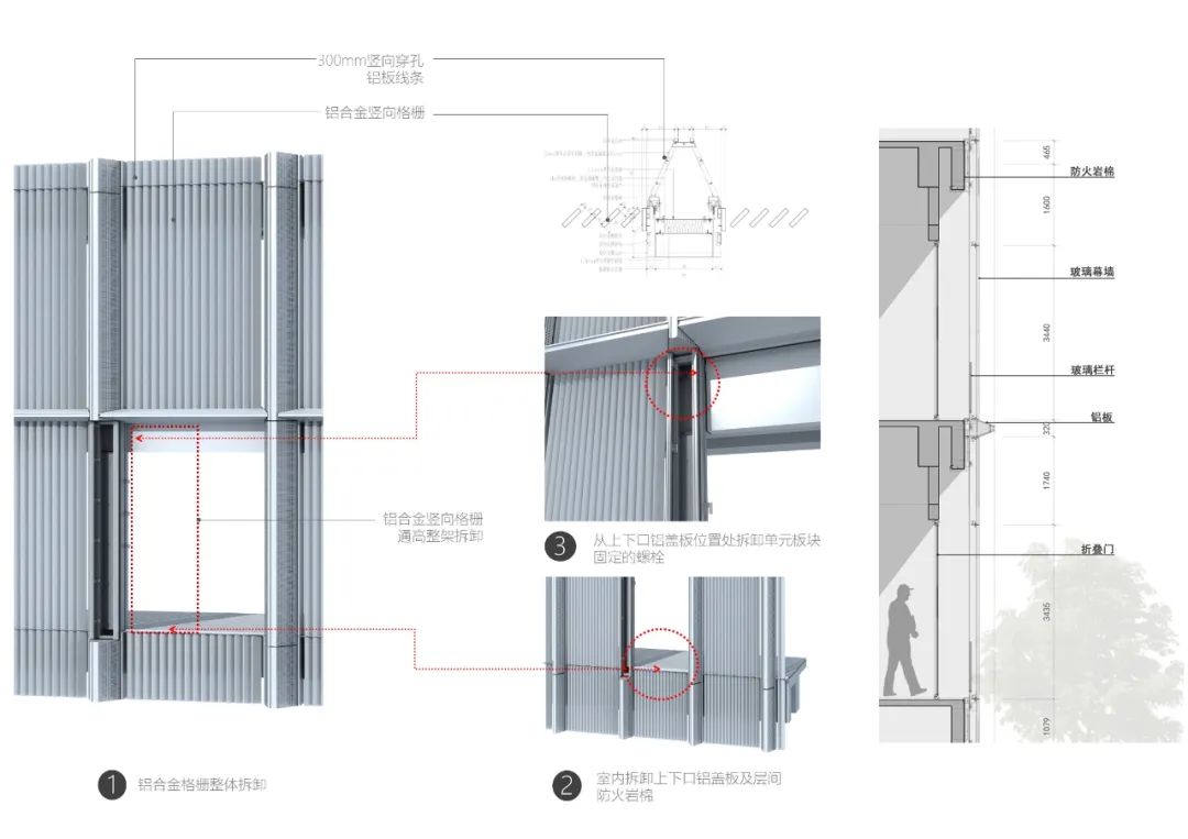 吊装口的设计是本案另一设计难点,如何“送货“上楼是我们着重思考解决的问题:既能满足大型设备运输,同时不破坏立面整体性及设计语言,还能满足建筑本身的热工要求。设计团队协同幕墙专家,经工艺、效果、成本及运维多维度综合比选,最终创新性地采用“内嵌折叠门+外挂可拆卸金属格栅”方案作为吊装口设计方案。模块化、可拆卸的立面设计显著降低建设成本,后期维护仅需拆卸局部格栅,无需破坏主体结构,大幅简化运维成本,在追求极致的实用性的同时有力的保障设计效果的完整呈现。