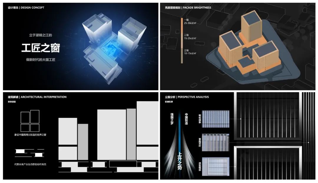 建筑夜景照明设计以“做新时代的大国工匠,实现中国智造强国梦”为立意,衍生出“立于濯锦之江的工匠之窗”的设计理念。光与影的交织与层次塑造,使建筑化身为象征工业创新与科技发展的“光之窗口”,向世界传递中国智造的卓越品质与时代精神。