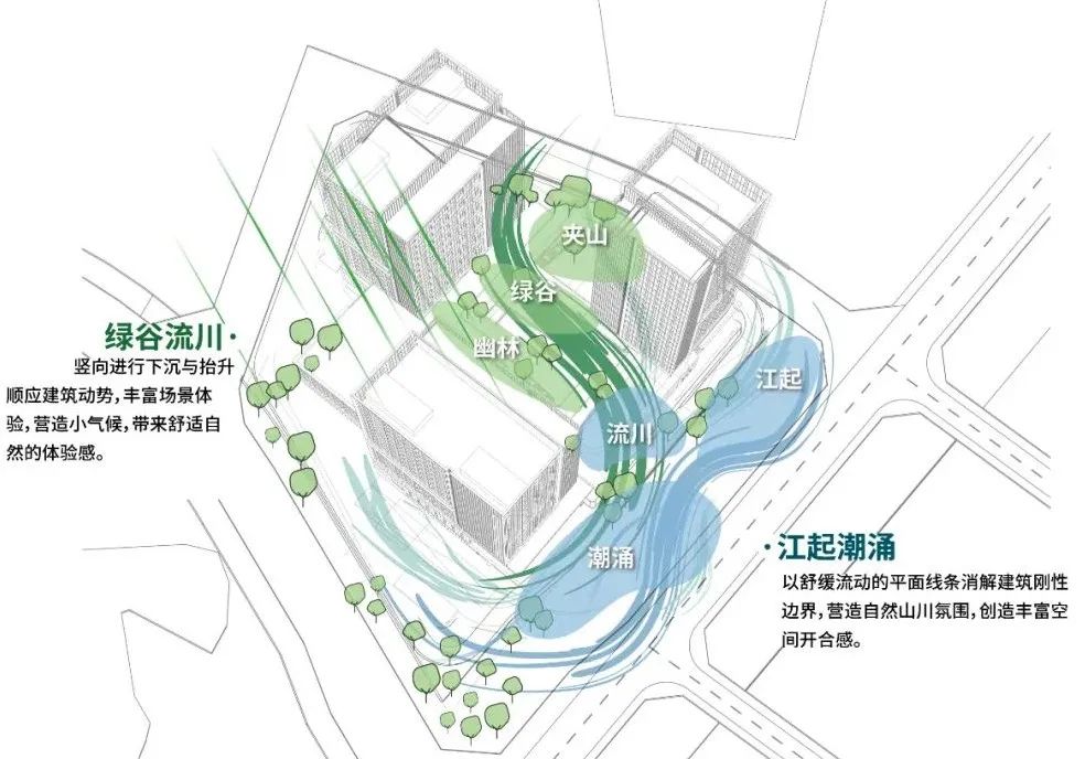 景观设计以溯源诗韵锦江,取锦江蜿蜒流动的“水”形,转译为“绿谷流川,江起潮涌”的景观语汇为概念;借建筑的布局形式,打造“一轴·两带·多重体验”的景观结构。