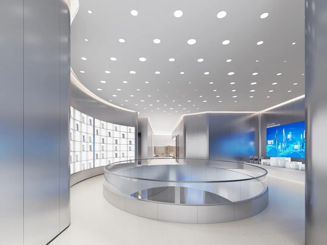 展示中心2F展厅:通过对于空间的元素进行拆分、解构、重组结合,打破固有的思维方式,通过环形挑空动线,将客群引导至品牌荣誉区及实体户模展示区,充分展示本项目的科技属性。