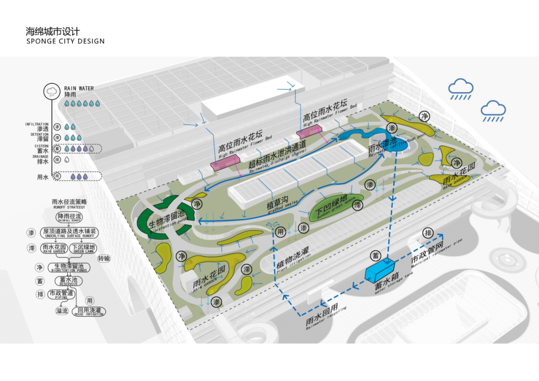 作为滨水建筑,生态可持续性是设计的基石。在八层的屋顶花园中构建了一个完整的海绵城市示范系统。这里整合了生态滞留池、植草沟、雨水花园等多种绿色基础设施,并设置了互动科普装置,直观展示雨水从收集到“渗、蓄、滞、净、用、排”的完整循环。