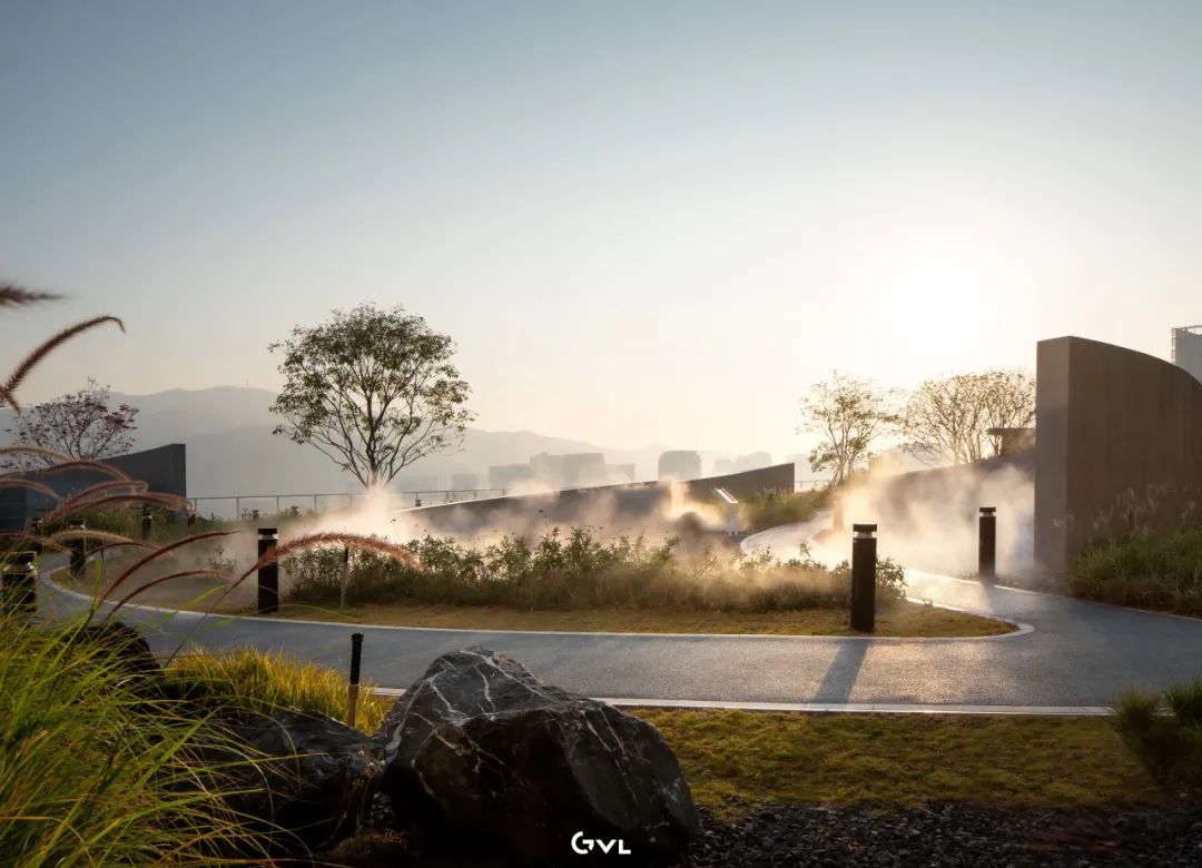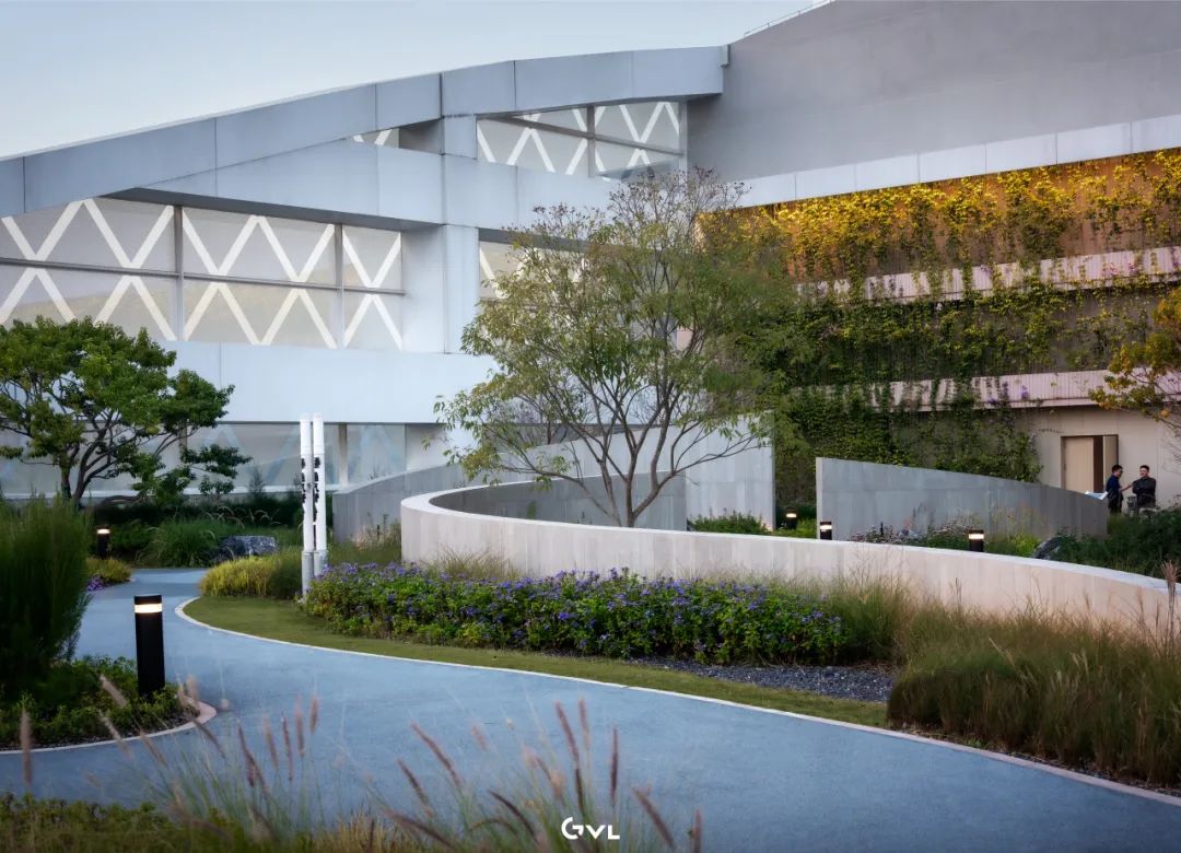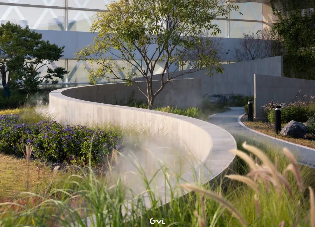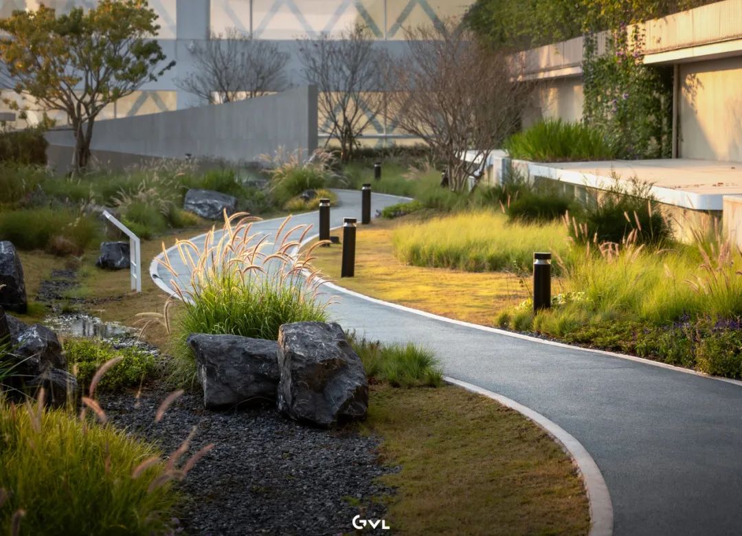 项目团队优先选用本地石材与环保透水铺装,以促进雨水下渗,减少城市排水压力,植物配置则以低维护的乡土乔灌木和观赏草为主,通过多层次的种植构建稳定且四时有景的植物群落。这些“会呼吸”的绿色脉络,不仅有效缓解了城市热岛效应,提升了生物多样性,也让建筑真正与环境和谐共生。