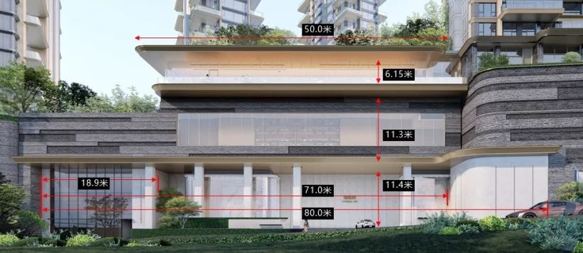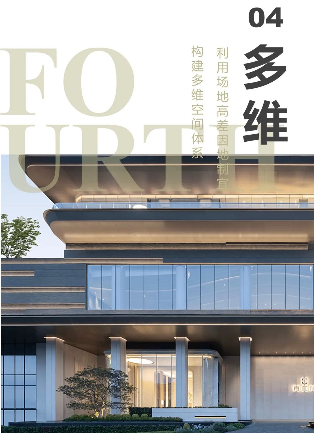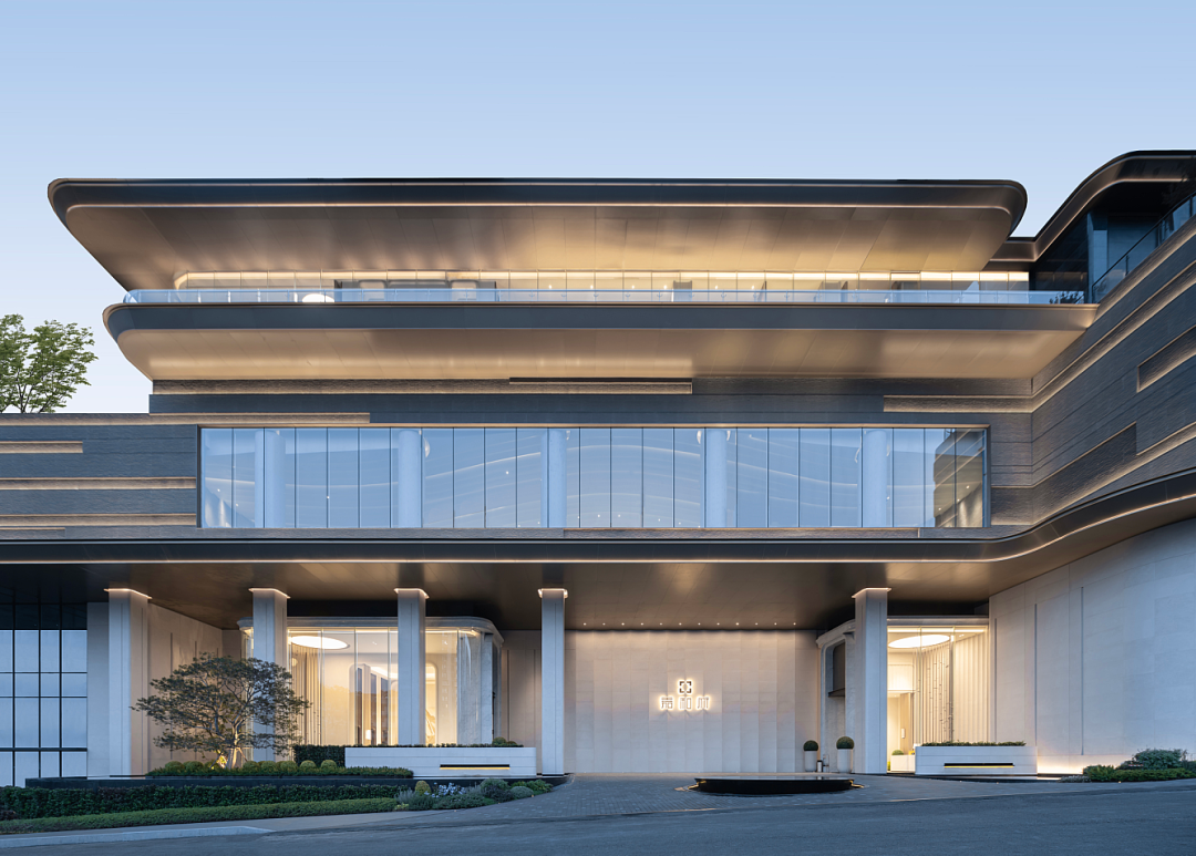 场地的高差成为设计的核心出发点,我们顺应山势进行空间营造与组织。设计巧妙地利用地形高差构建多维空间体系:首层与城市道路平接,设置集回车落客、入口门厅等多功能于一体的城市花园门庭,其超尺度灰空间既是对外开放的城市界面,又是进入社区的过渡场所;二层打造泳池会所;三层与大区标高衔接作为城市会客厅,通过收放有致的空间序列营造丰富的体验层次。