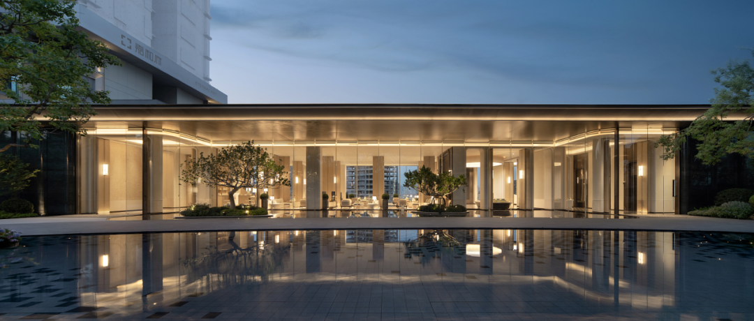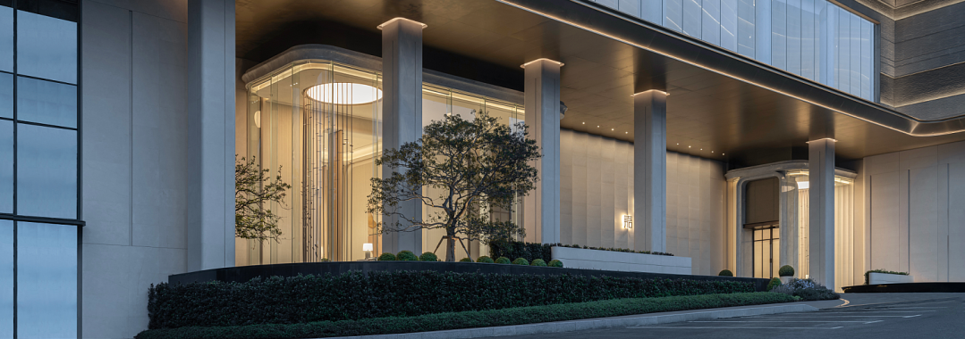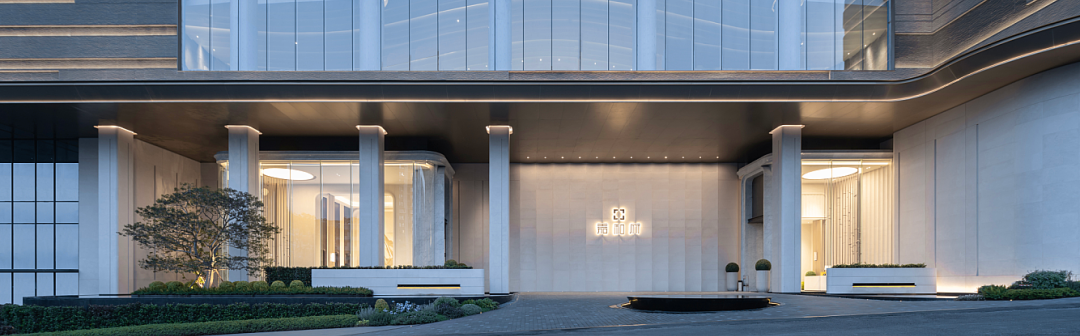 五根米色大理石巨柱凝练重庆山城意象,材质选用类汉白玉石材,既承袭东方殿宇的尊贵基因,又以现代构成演绎山水意境,凝练成极具辨识度的空间印记。序列感排布的柱廊灰空间也丰富了整体的空间层次,更显酒店式归家仪式感。