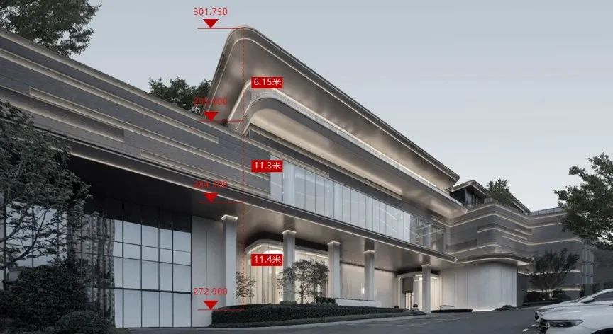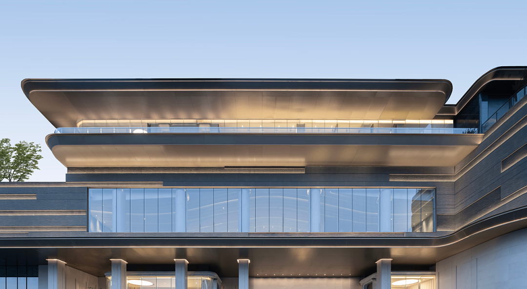 整个展示中心以约80m左右横向延展的极简线条勾勒出恢弘尺度,三层错落的纵向体量以挺拔姿态、奢阔的层高比例重构社区门楼的仪式感。首层落客区以高约十余米挑高的挑高空间,与约16m左右的景观照壁相映成趣,宛若流动的艺术画框,搭配序列式巨柱柱廊构成的灰空间,营造出尊贵的酒店式迎宾礼仪。三层城市会客厅以通透界面延续横向张力,约6米层高搭配约36米的连续延展玻璃幕墙,让建筑犹如剔透的水晶匣般,展现轻盈通透的现代气质。