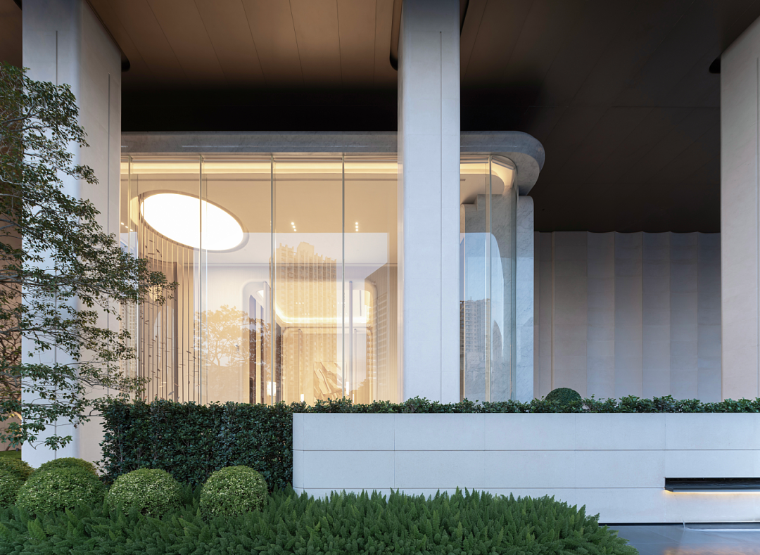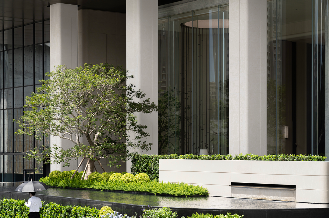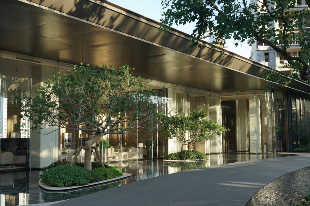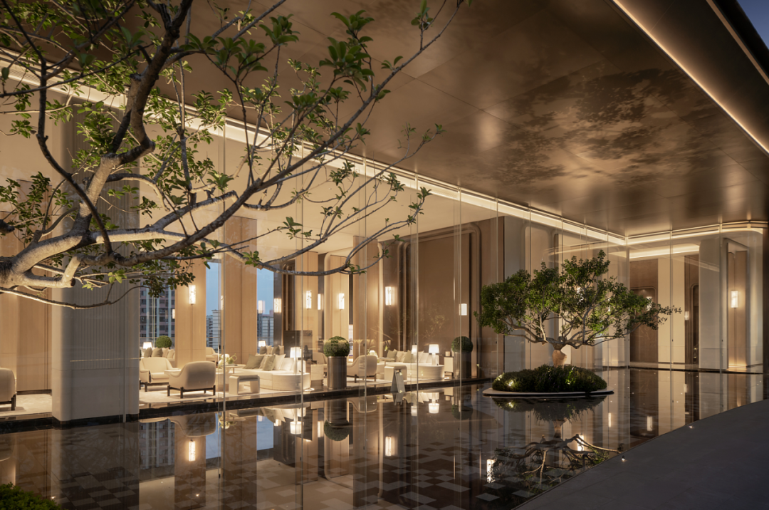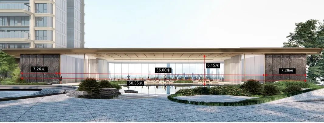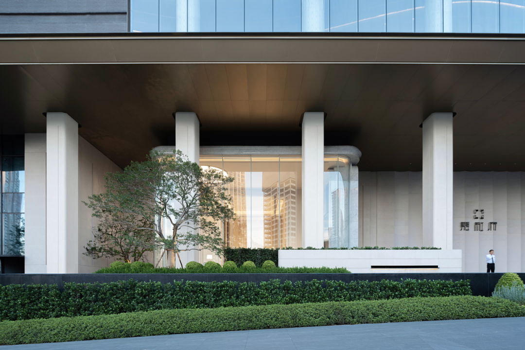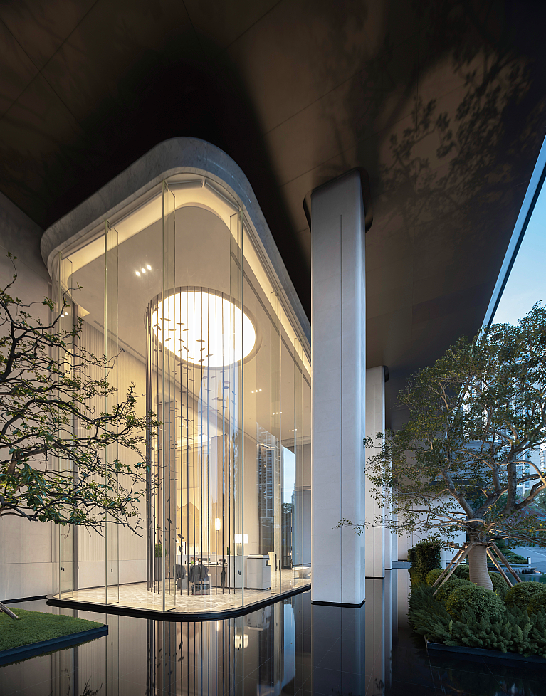 区别于传统封闭式门庭的单一功能属性,本案首层采用舒展的开放式布局,将落客区、入口门厅与城市花园有机整合,超尺度灰空间以通透轻盈的界面形象,两侧嵌入的玻璃盒子以消隐手法弱化建筑边界,打造云端酒店式的轻盈意境。