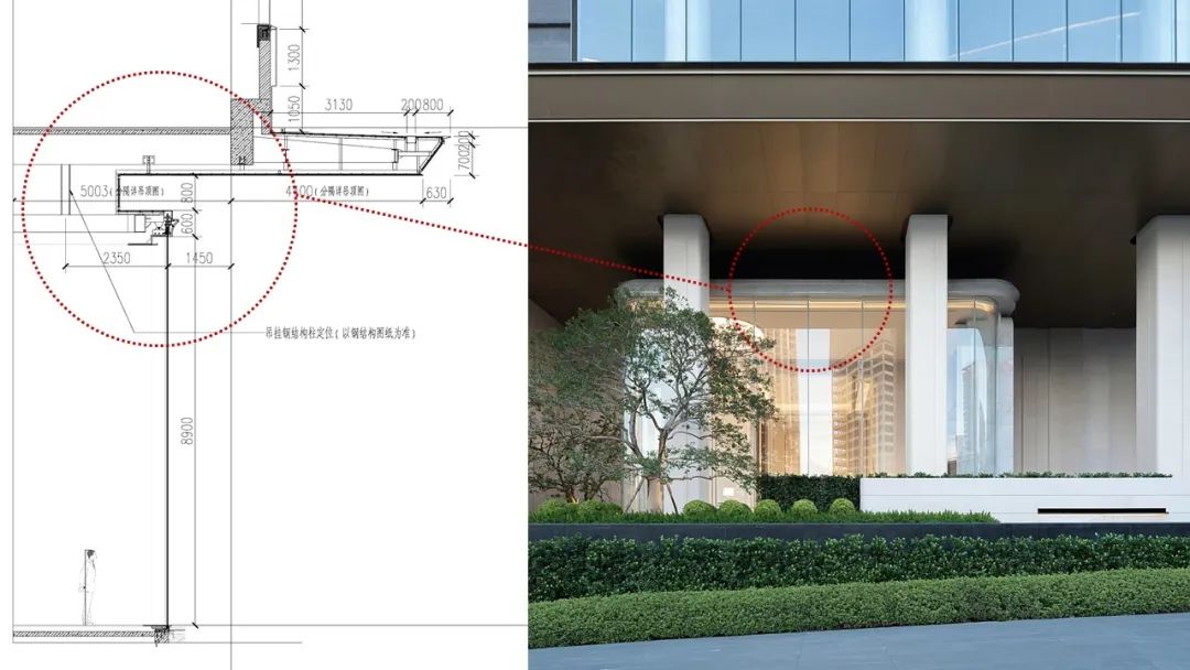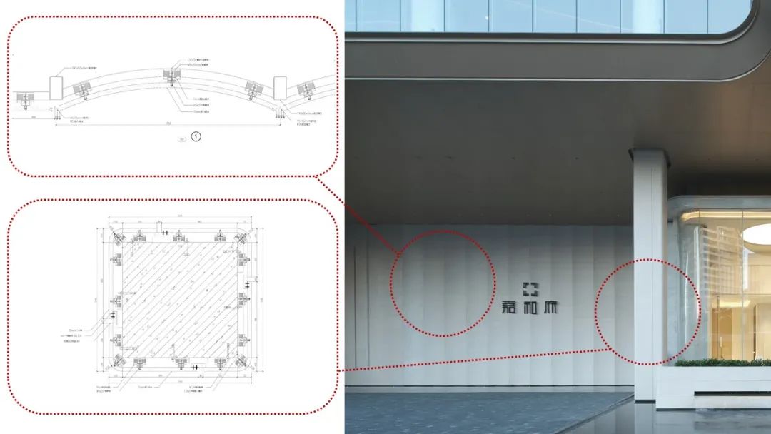 墙身也有些独特的处理方式,门楼首层两侧的玻璃盒子采用了极具挑战性的结构设计——高达9.6米、宽约15米的超大空间完全摒弃了传统内部支撑,创造出一个极致通透的视觉体验。这一设计通过创新的弧形热弯玻璃与强化玻璃肋的完美结合,配合精妙的悬挂结构系统,实现了建筑力学与空间美学的平衡。