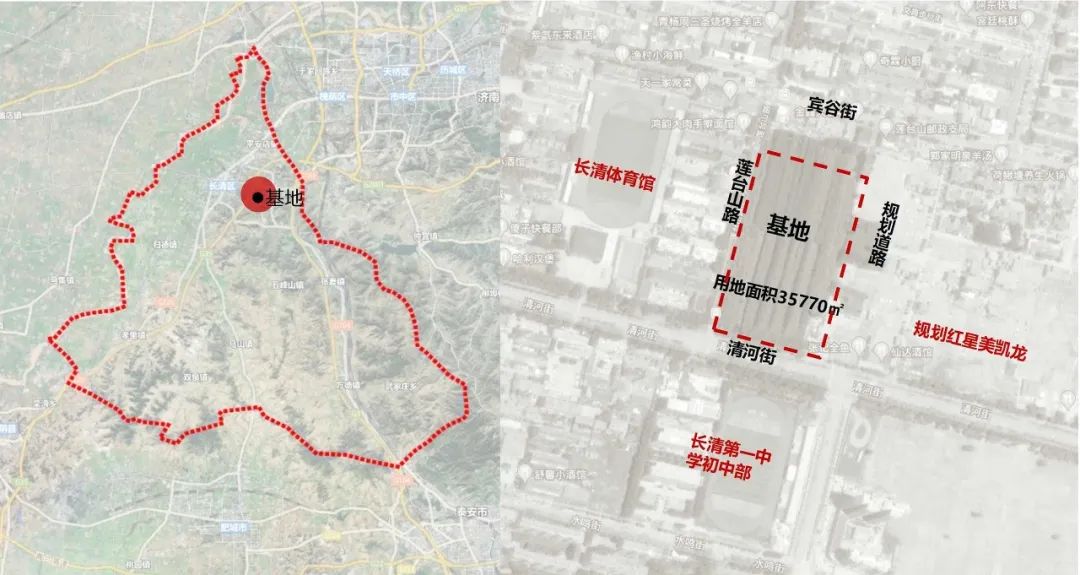 长清区境,春秋战国时属齐国。颇具历史渊源,在漫长历史发展中,渐渐成为人文荟萃之地。基地位于清河街北侧,西临长清体育馆和长清人民法院,南邻长清市第一中学,北侧为规划住宅区,处于市中心的位置,市民活动较为活跃区域。本项目既要承载长清历史文化,又要为市民提供一个开敞活动交流的空间,我们将四馆定位于既古典庄重,又具现代活力的“城市起居室”。