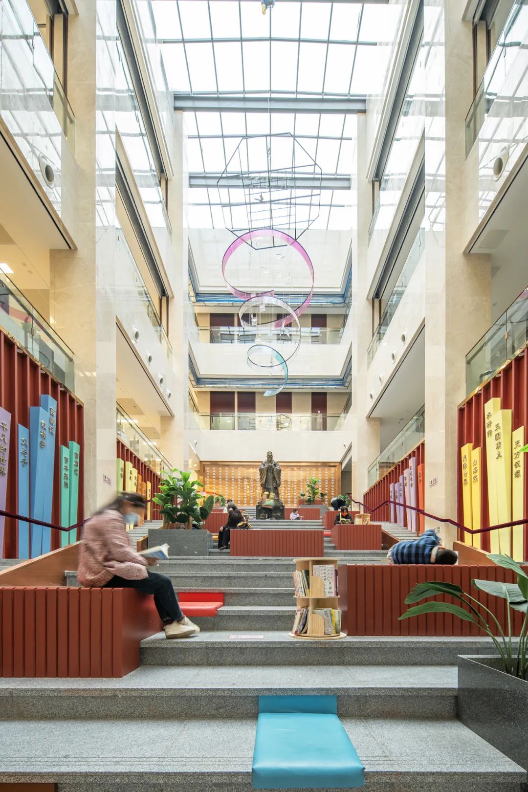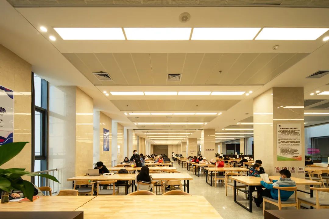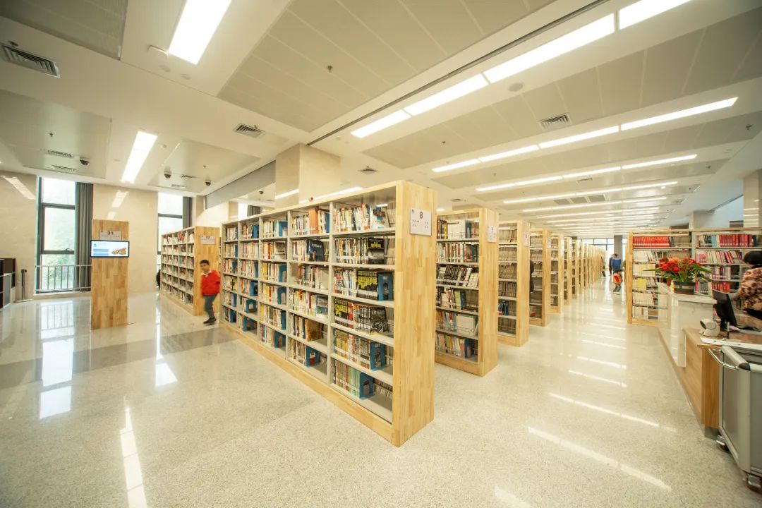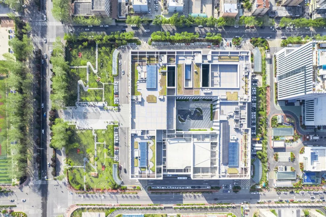 图书馆场馆位于场地西南,包含图书馆及青少年活动中心两部分主要功能。场馆中部设置开敞内庭院,增加空间感,共享庭院的存在也提升了建筑品质。庭院北侧一至三层为青少年活动中心,庭院南侧一至三层及场馆四、五层为图书馆。