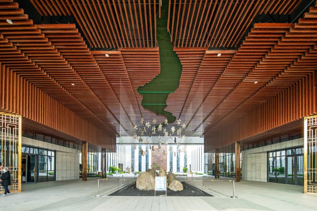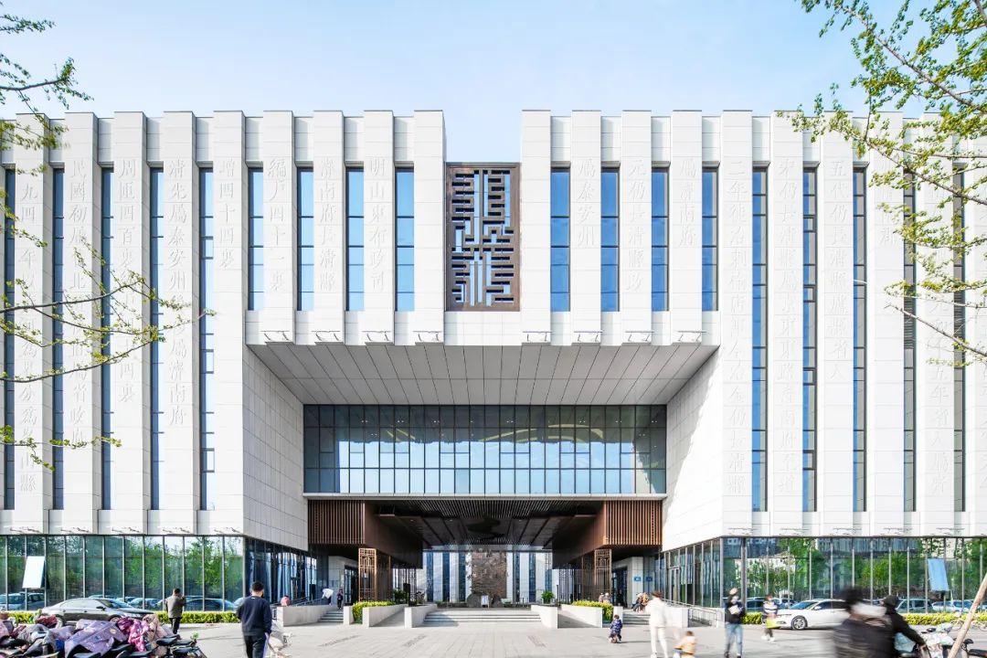 将传统中式元素有机地融入到四馆现代风格的建筑及细部设计中,比如书简元素,中式回文元素,齐长城元素,中国印元素。