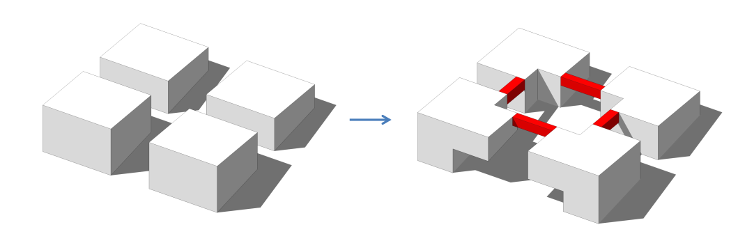 各单体依次布局在中轴线上,同时结合架空连廊和景观平台,形成建筑内外有机结合、互相渗透,体力化多层次,全民共享的“城市起居室“。即富于建筑心旷神怡之感,更加体现了“天人合一” 的思想。中轴线的手法同时兼顾了四馆的均好性,并根据四馆的采光属性南北布局。