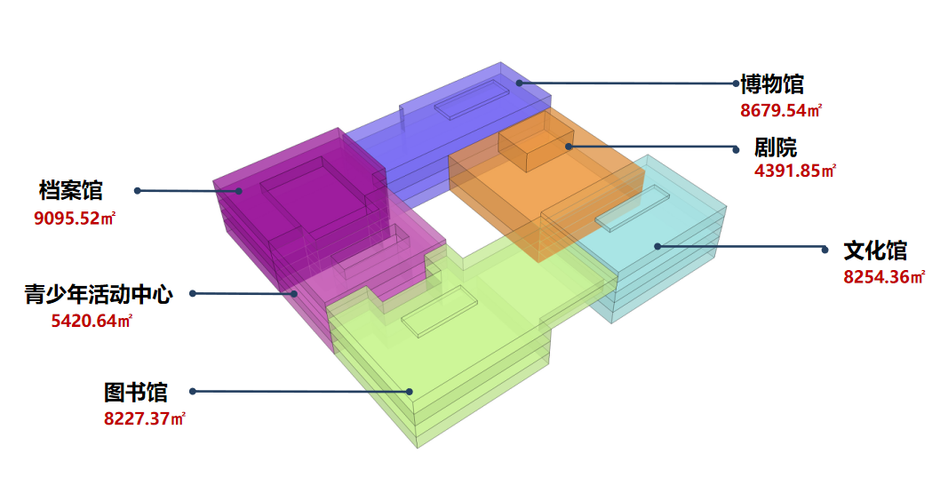 文化馆场馆位于场地东南,包含文化馆及剧院两部分主要功能。场馆一二层东侧及三、四、五层设置剧院,其余为文化馆。