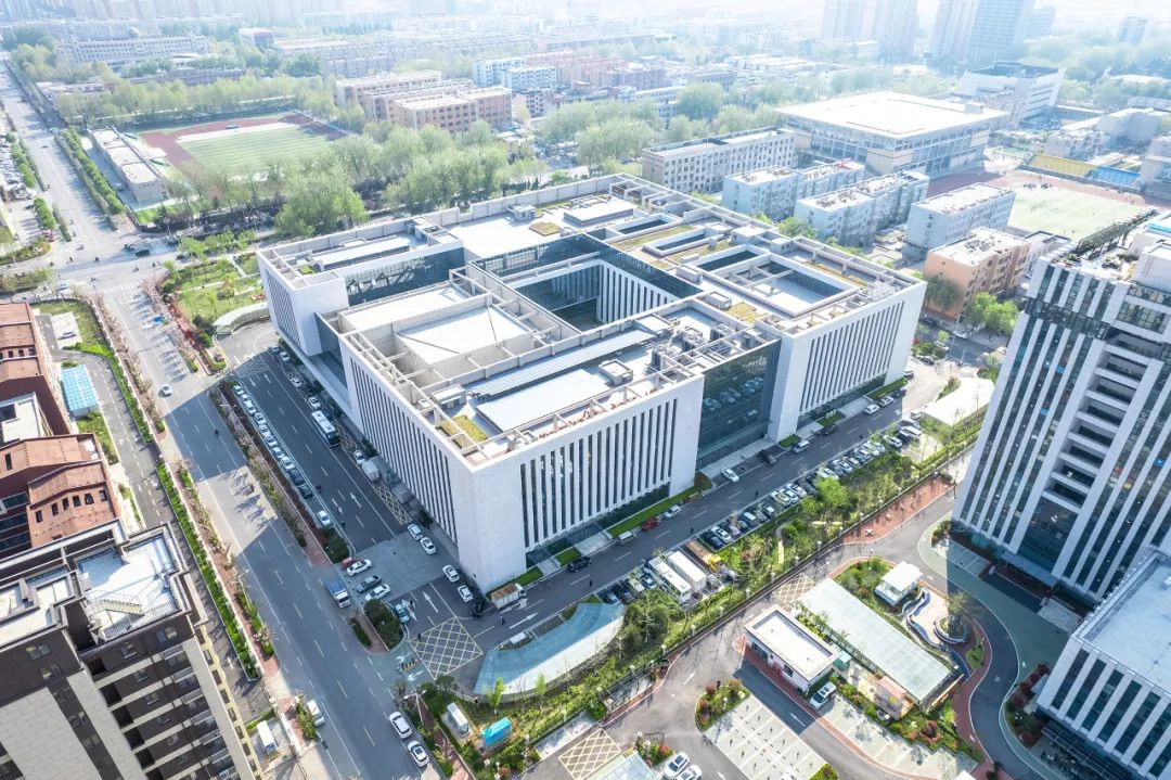 档案馆场馆位于场地西北,场馆西侧面向城市次干道,首层西侧设置群众门厅,北侧分设办公门厅及后勤门厅。五层设置架空连廊与博物馆相连,并设置架空造型与图书馆相连。