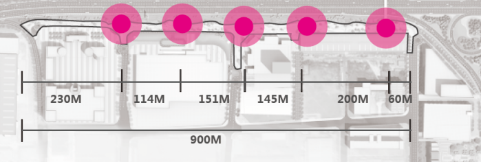 结合周边建筑业态、人流密度,以100-200米进行节点设计,制造人群游览的敏感点,建立连续的景观体系,塑造多样的景观节点空间,达到一步一景的效果。