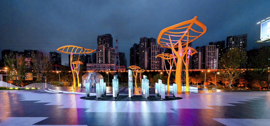 在奥特莱斯与宜家交接的开敞空间,设置动感、魔幻的商演舞台,作为商业的延申。由黄葛树叶演变重构的叶形构架,采用不锈钢橙色烤漆的材料,嵌入投光灯,结合周边的动感灯柱,形成炫彩的时尚剧场。