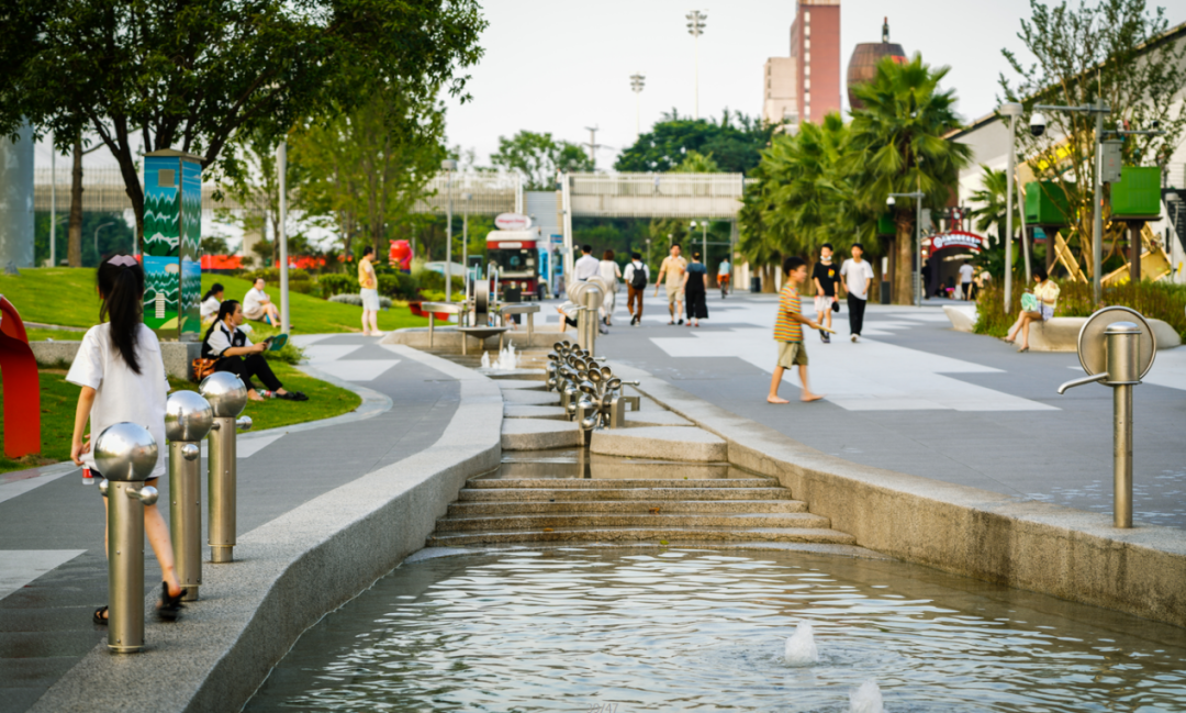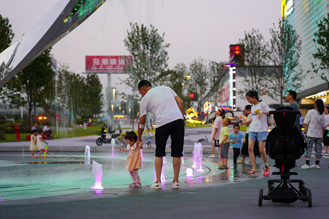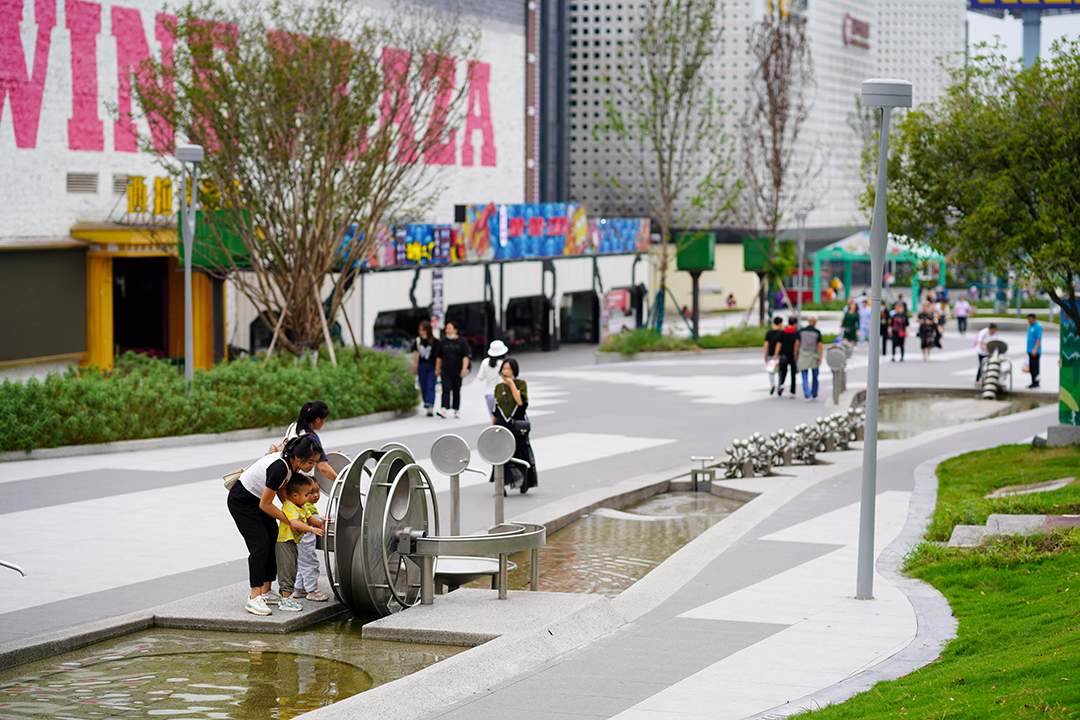 在美心门红酒广场,设计面积约140平方米的一大一小戏水池。将水与互动器械结合,丰富了孩子们的趣味体验。